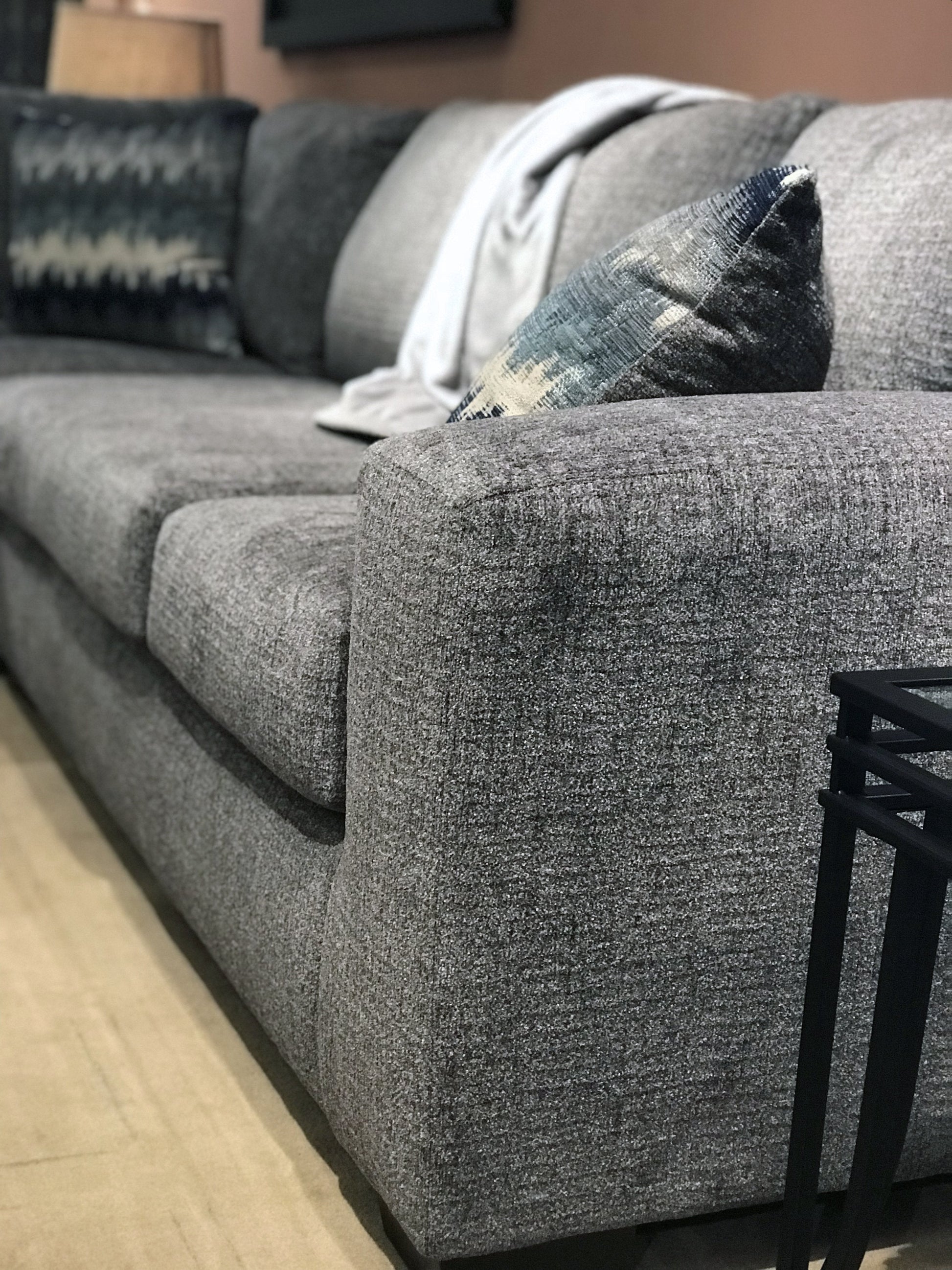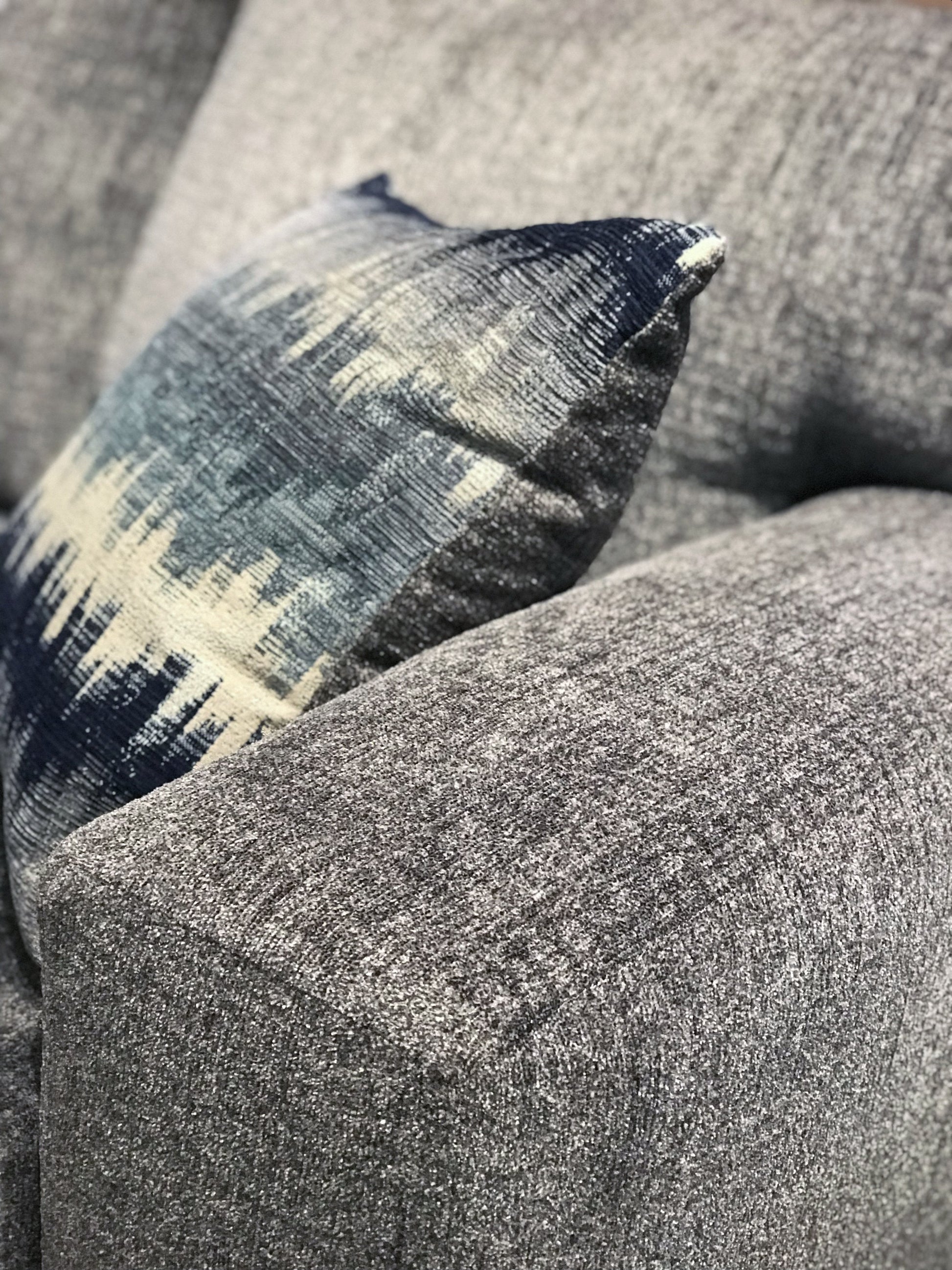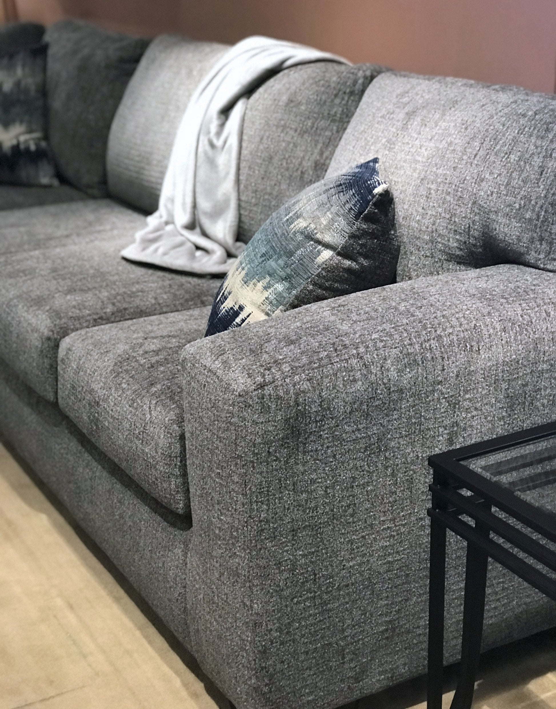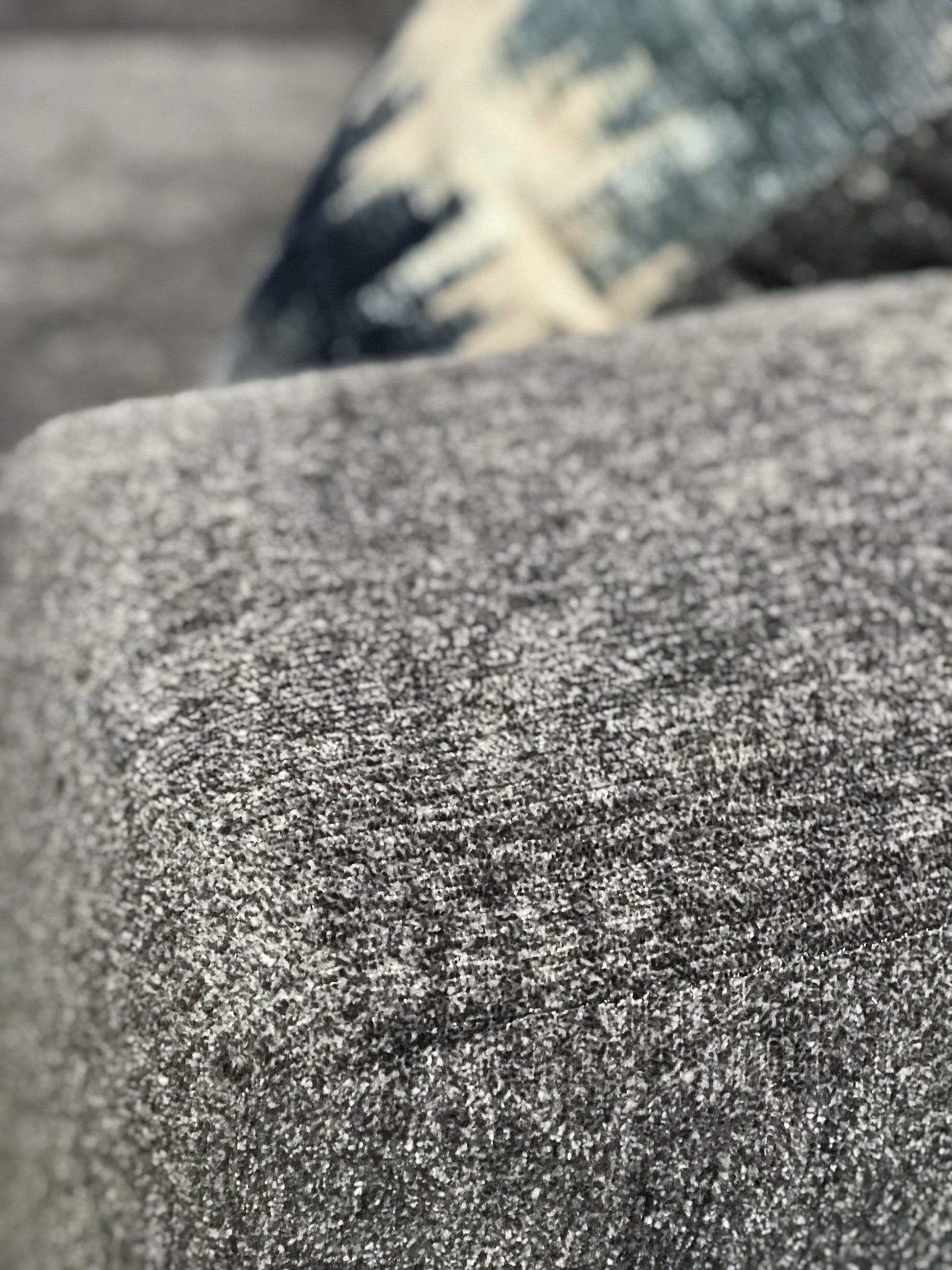 - Textured gray fabric upholstery with overstuffed back cushions to provide comfort