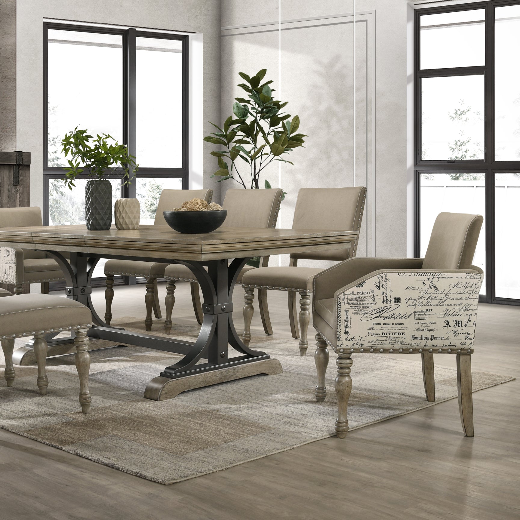 Transform your dining room with the BirminghamDriftwood 7-Piece Dining Set, where rustic charm blends seamlessly with refined craftsmanship. The centerpiece table showcases a driftwood finish that enhances the natural wood grain, supported by a timeless double pedestal base. An 18" extension leaf expands the table to comfortably seat up to eight guests. Completing the set are four side chairs and two armchairs?€?each featuring script-printed backs, tan microfiber upholstery, and nailhead trim accents. This thoughtfully designed set brings both comfort and character, making it ideal for everyday meals or special gatherings.