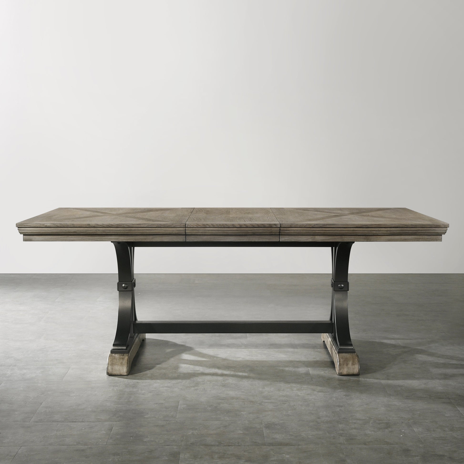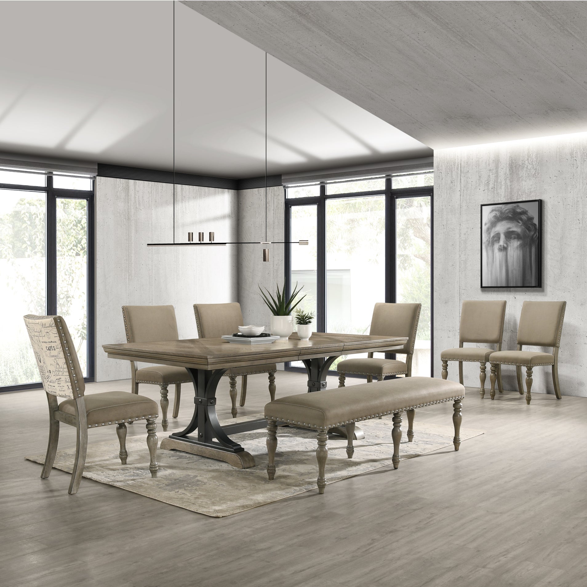 Create a warm, inviting dining space with the Dasher Driftwood 8-Piece Set. The table features a driftwood finish, natural wood grain details, and a sturdy double pedestal base with an 18" extension leaf for gatherings of up to 8. Paired with 6 side chairs, and a bench?€?each with script-printed backs, soft microfiber seats, and nailhead trim?€?this set blends comfort, charm, and timeless style.