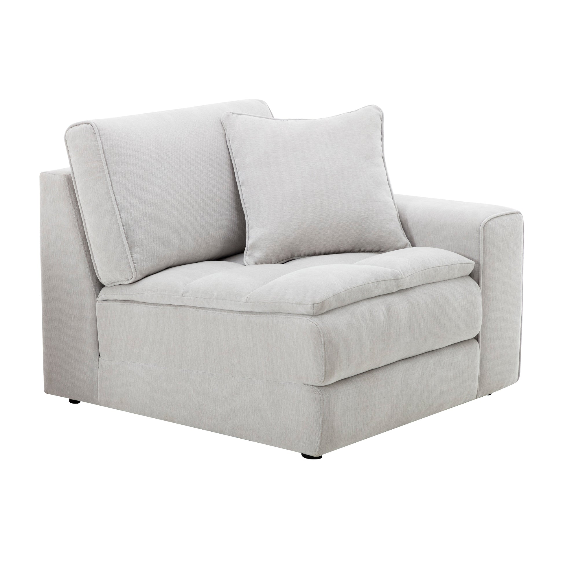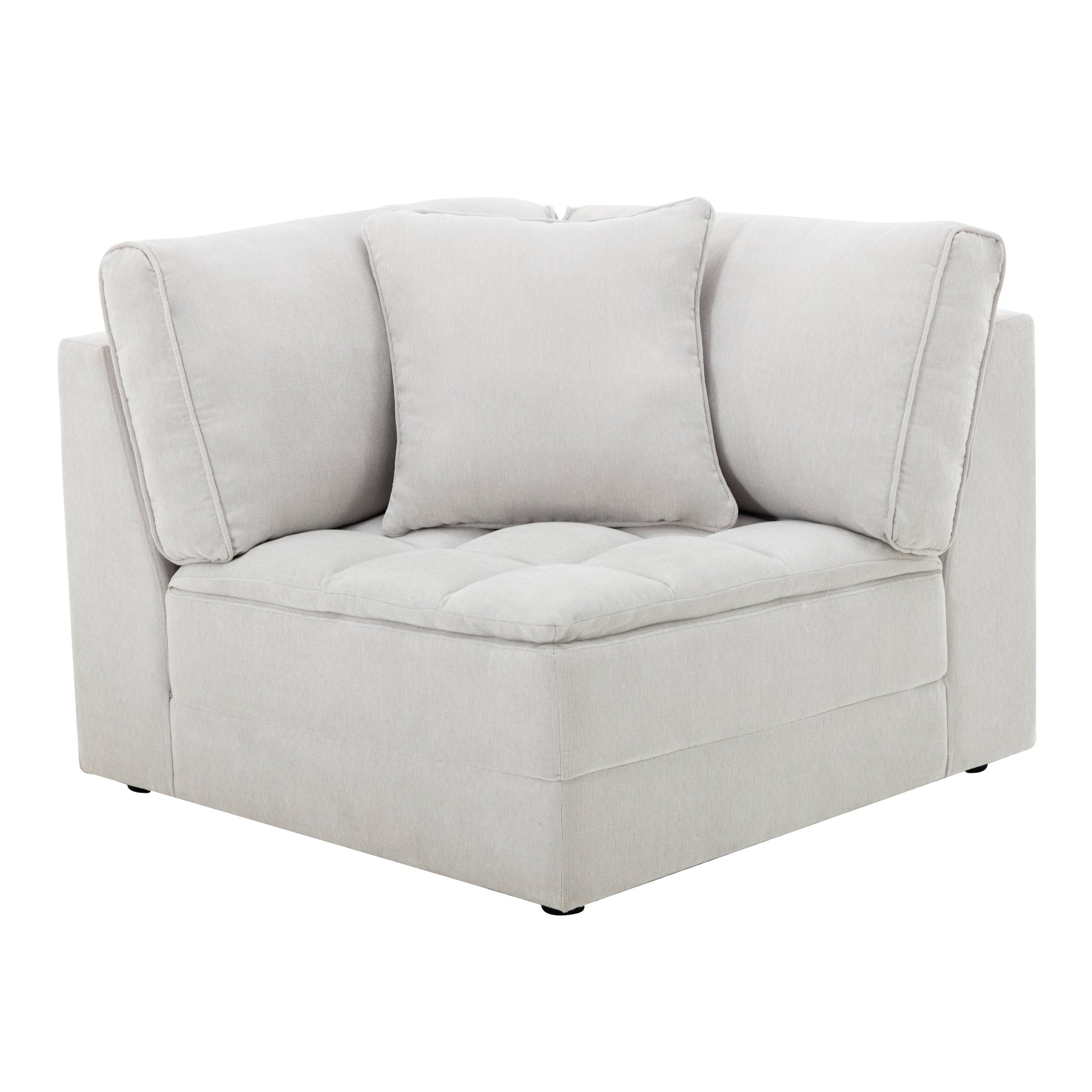 - The modular sofa set includes two single-arm seats, two armless chairs, and a corner piece. Polyester-blend fabric upholstery in a neutral oyster gray color