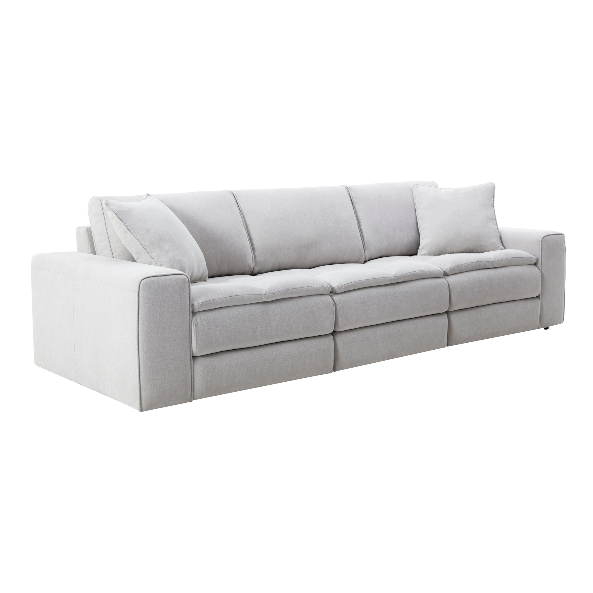 Treat yourself to a minimalist, modular modern sofa to help redefine your living in the Breton Contemporary Fabric Tufted Sofa, Oyster. This wide sofa comprises an armless chair and two single-arm chairs, combined into an expansive sofa. Wood constructs each piece, padded generously with high-density foam and upholstered in a polyester blended fabric. The neutral oyster gray will fit into all kinds of room decor styles.