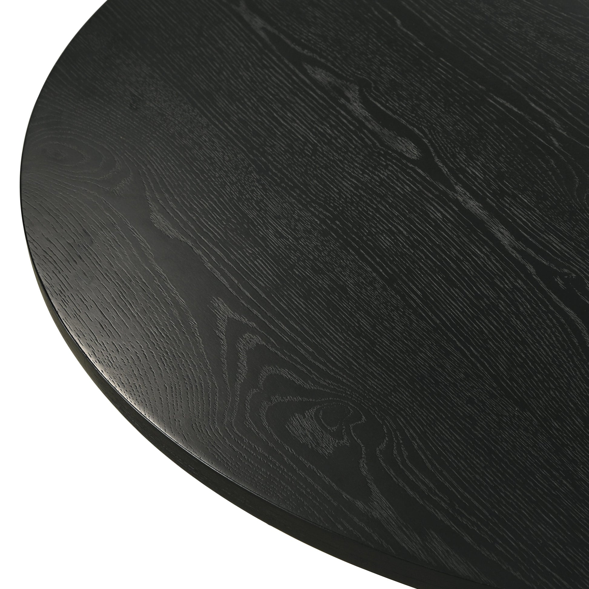 - A stunning dining table that blends contemporary design with modern aesthetics, featuring an Ebony finish. It has a round MDF and oak veneer tabletop, showcasing a beautiful natural wood grain texture. The table stands on a sturdy, stylish pedestal base made of solid rubberwood, ensuring stability and durability.