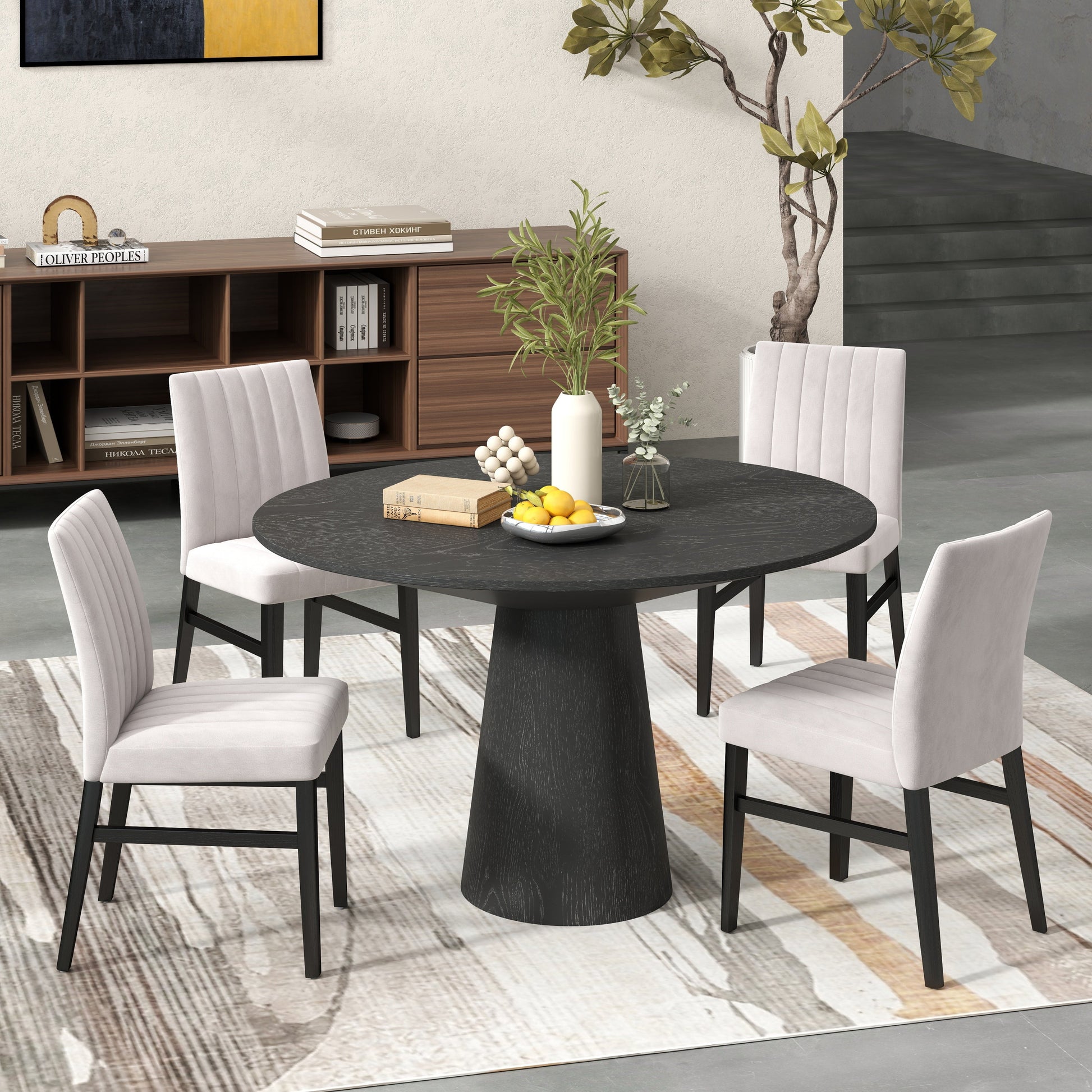 The dining table features a sleek pedestal design with a round tabletop that provides ample space for family gatherings and socializing. The meticulously crafted tabletop is constructed of MDF and oak veneer with an ebony finish that adds elegance and charm. Complementing the table are stylish chairs upholstered in premium fabric with a tasteful wide channel design for a chic flair. Rubberwood legs in a rich-black finish provide stability and durability
