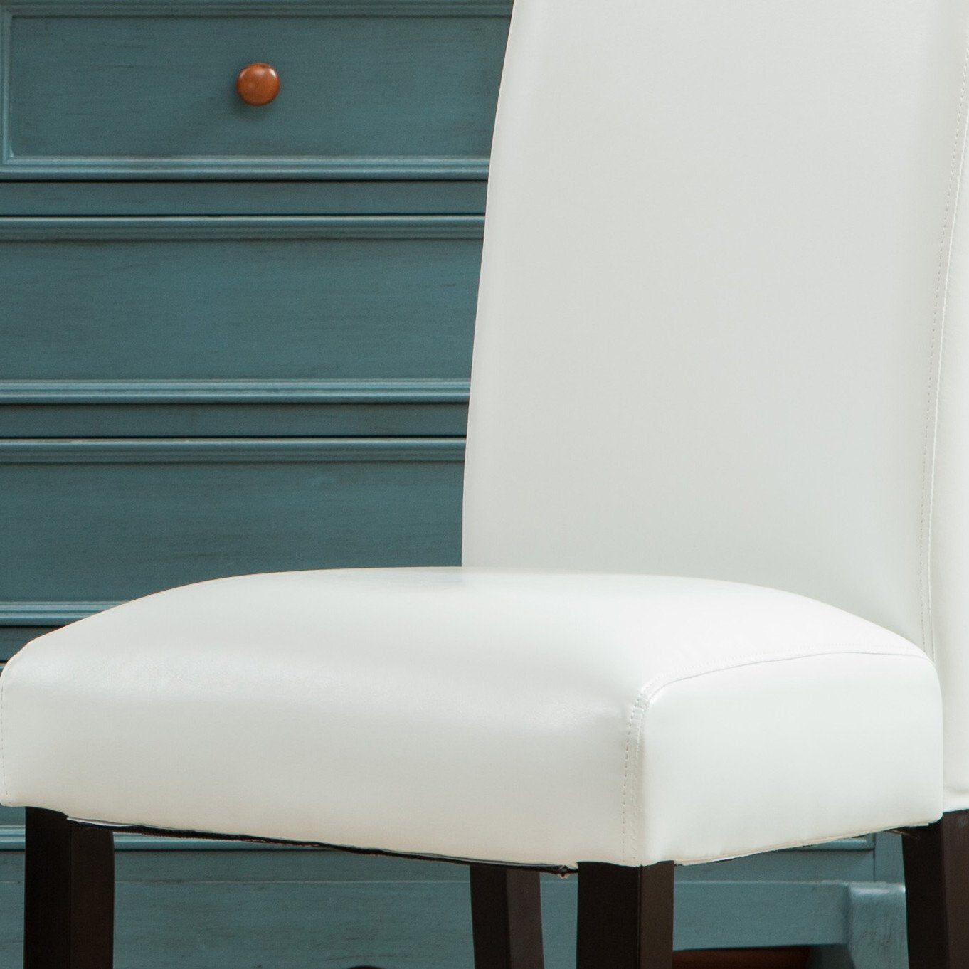Decorate your home with this comfortable and elegantly designed Donatello Leatherette Padded Parson Chair. This handsome duo sports a contemporary, geometric style that's softened with a layer of dense polyurethane foam beneath faux leather upholstery. The high back has a gentle curve that ever-so-slightly adds comfort to the art noveau-inspired style of this high-end pair of chairs. This clean-lined chair comes in your choice of four coloues: Blue, Brown, Black and White.