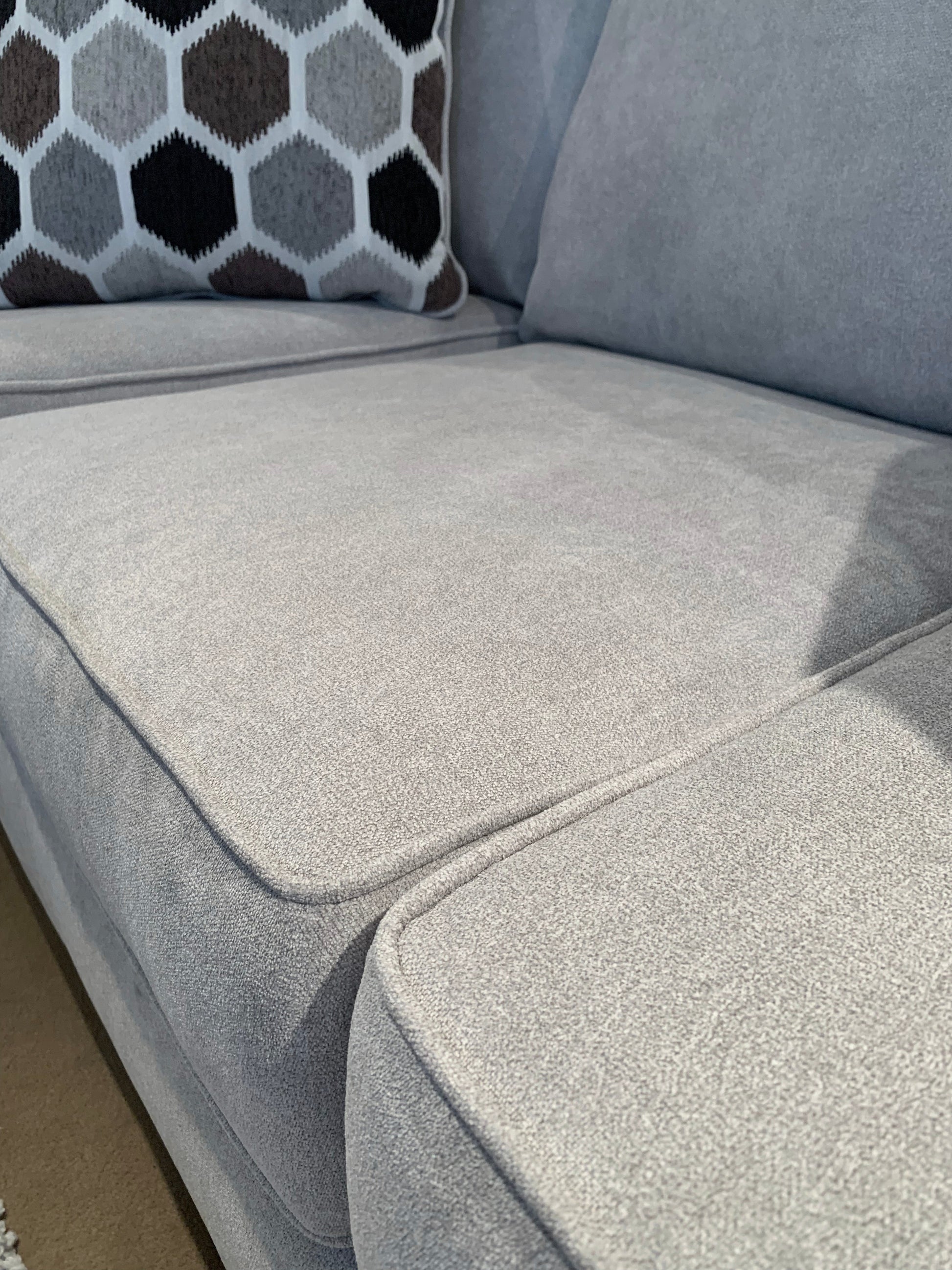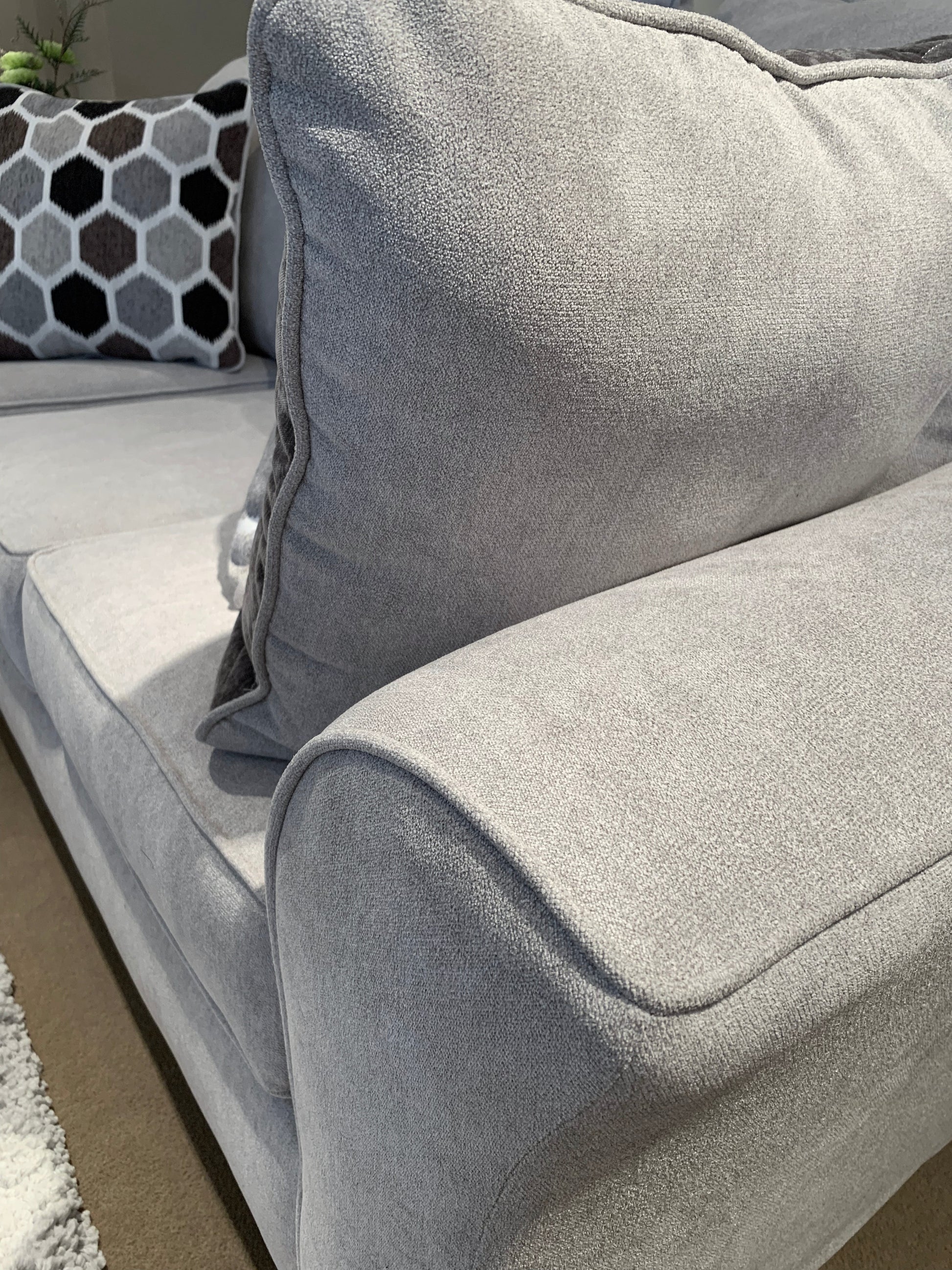 - Textured silver??fabric upholstery with overstuffed back cushions to provide comfort, throw pillows included
