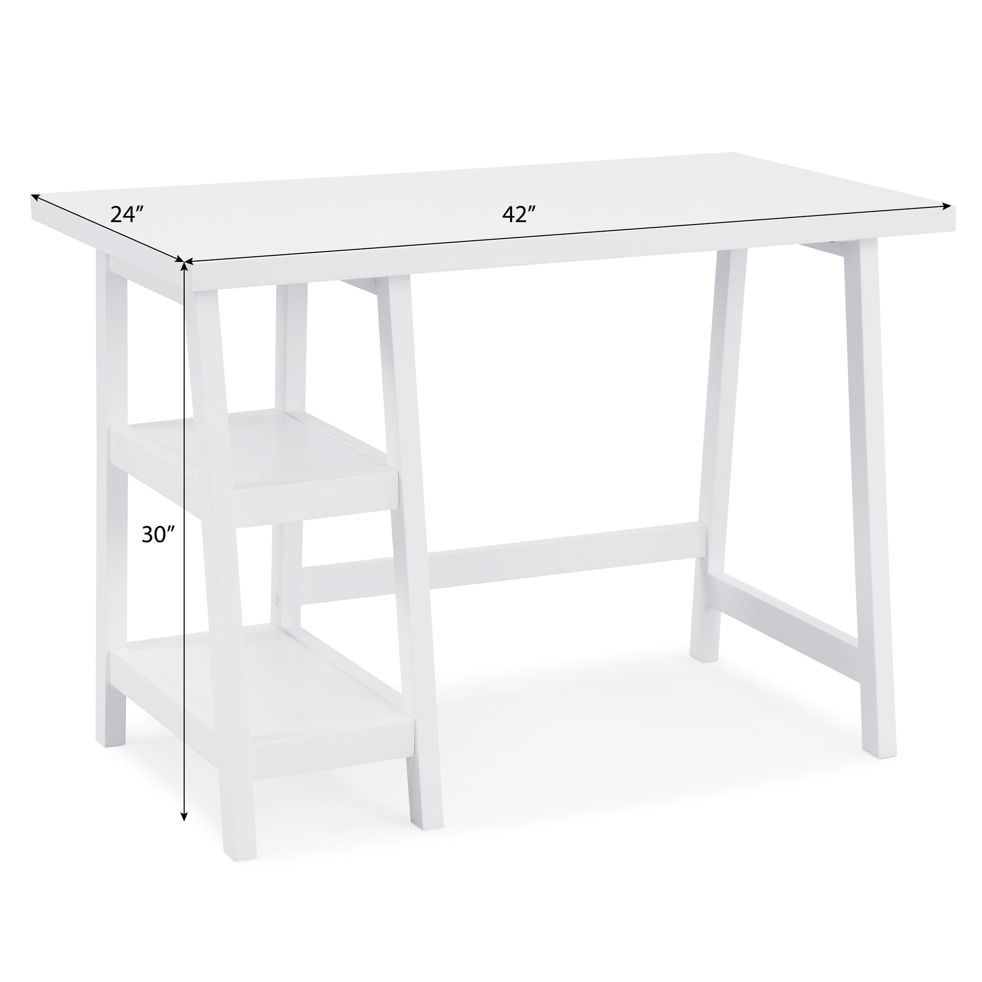 - The desk features two open shelves