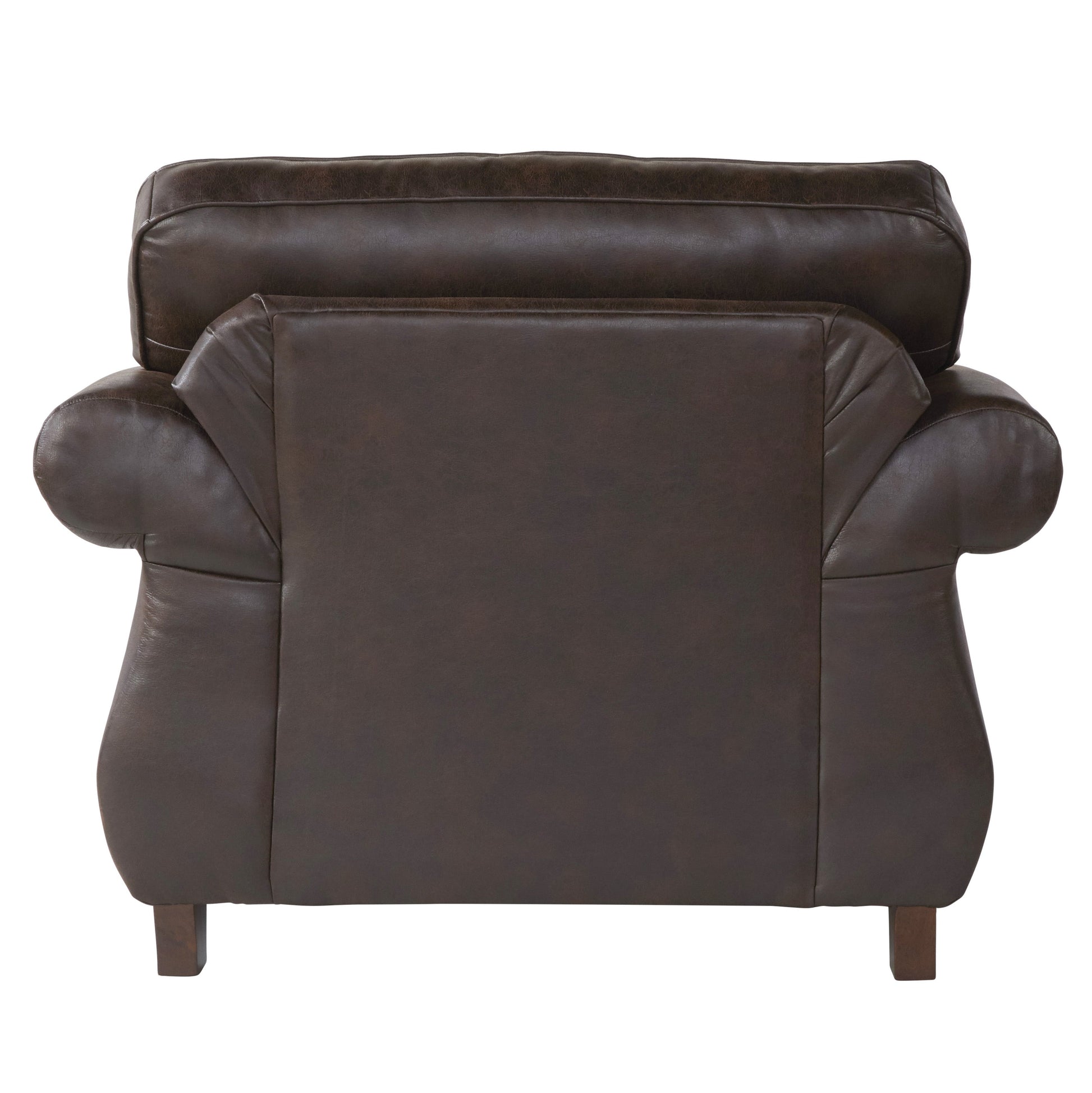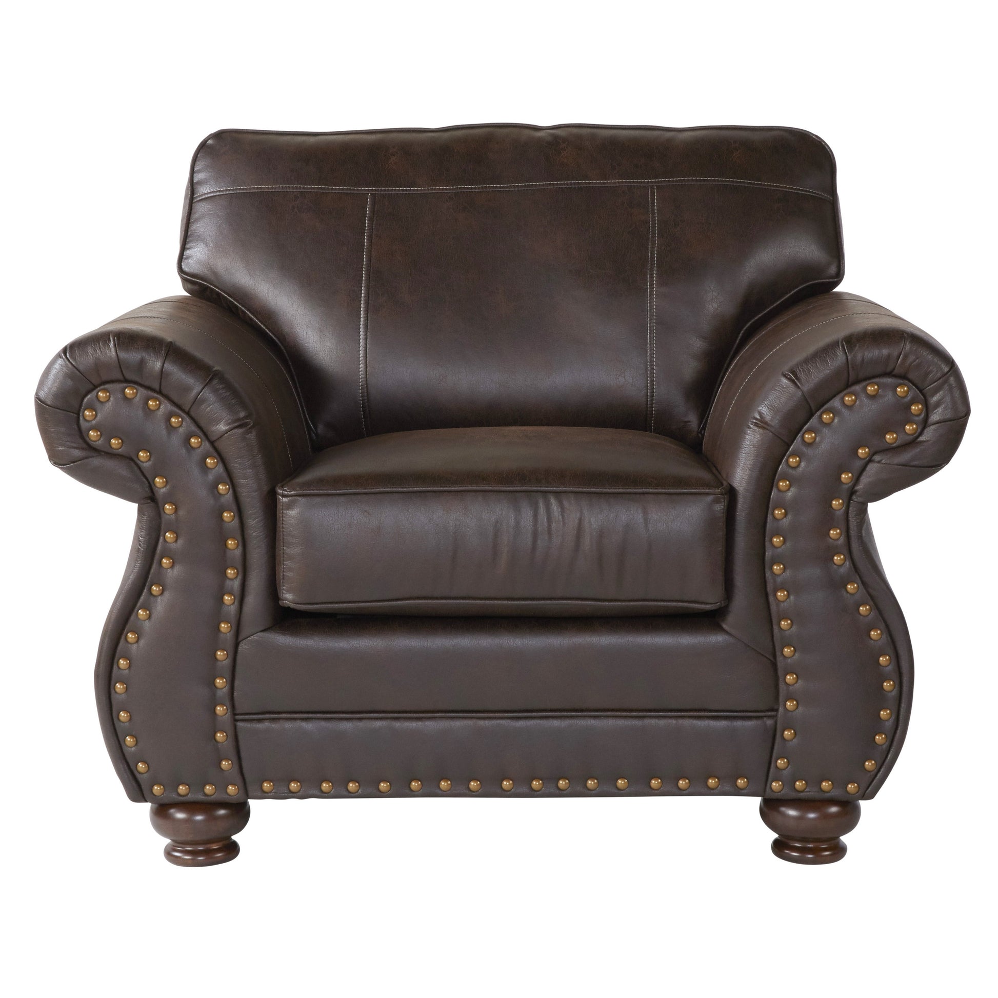 A classic silhouette and antiqued brown coloring make the Leinster Faux Leather Upholstered Nailhead Chair traditional with a casual twist. This chair is equipped with dramatic rolled arms, detailed welting, and striking nailhead trim. The soft faux leather upholstery comes in a deep espresso that coordinates with any decor.