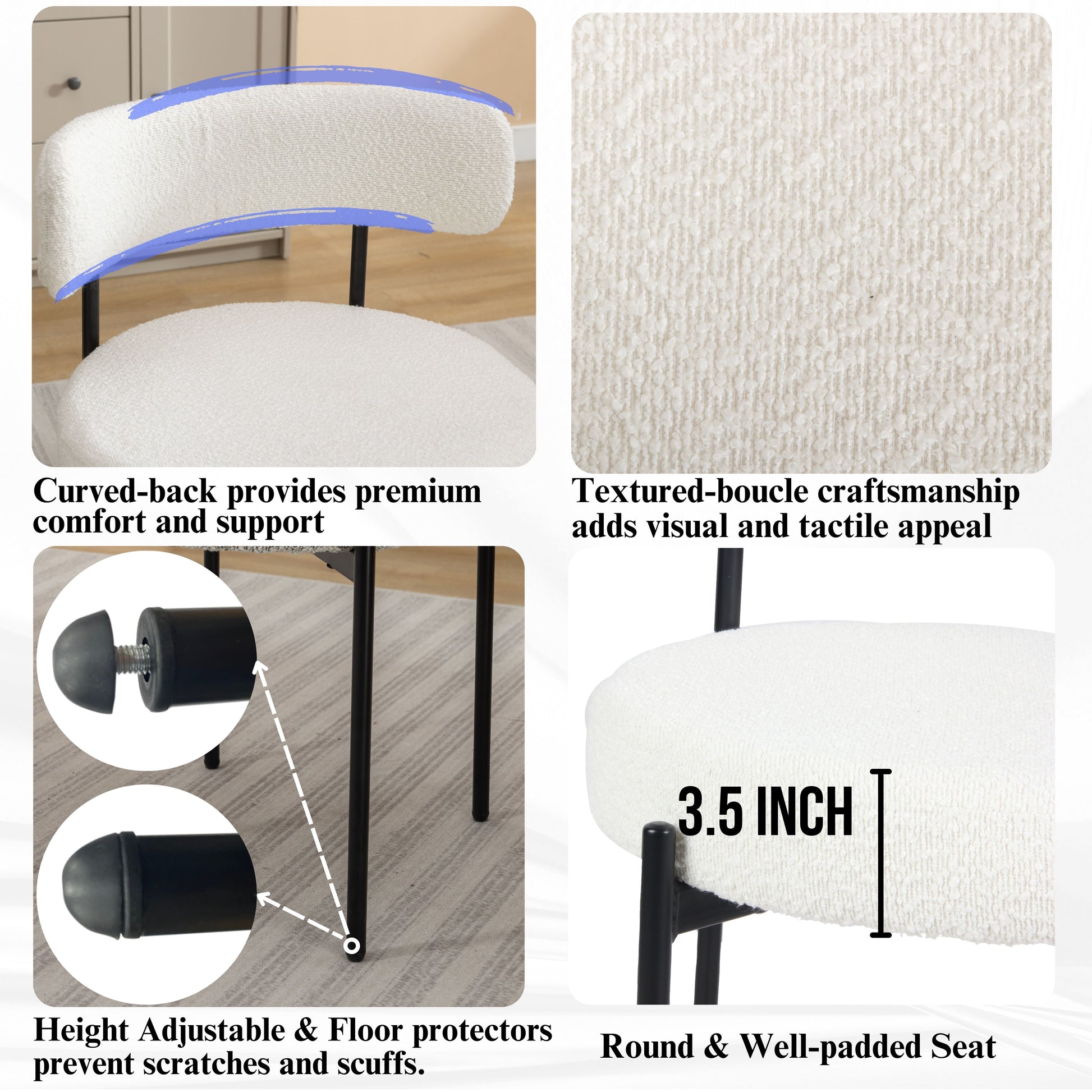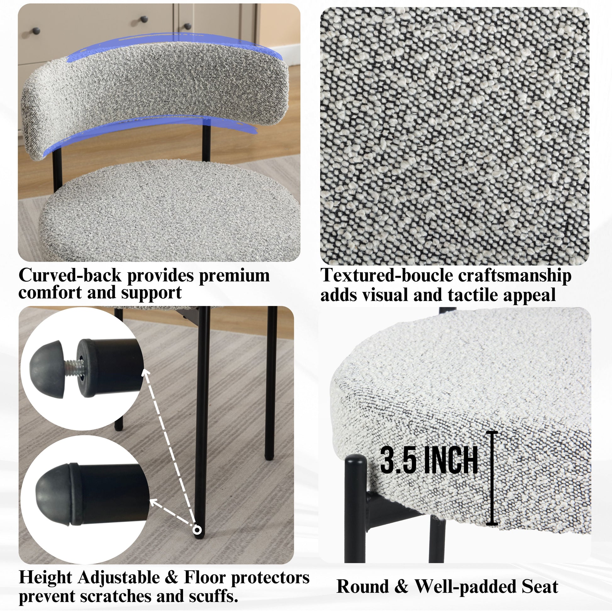 - [BOUCLE-TEXTURED CHAIRS]:The chair brings a contemporary aesthetic to any modern dining area with its clean lines, rounded silhouette and vibrant color. The curved design provides comfort and support, while the textured boucle craftsmanship adds visual and tactile appeal.