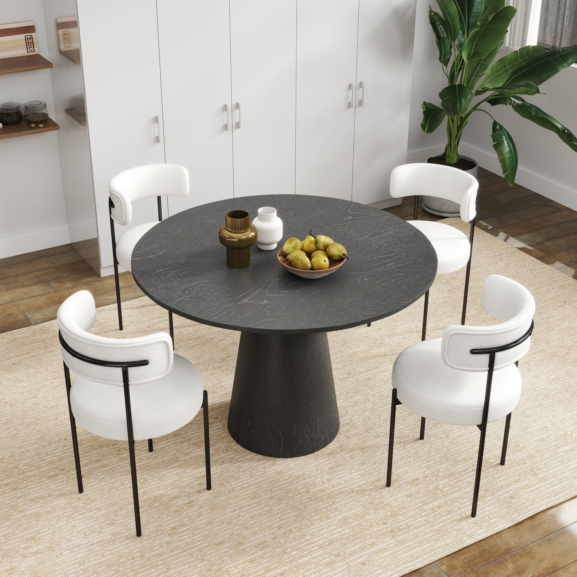 The dining table features a sleek pedestal design with a round table top, providing ample space for family gatherings and socializing. Crafted with care, the table top is made of MDF and oak veneer, showcasing a solid color that adds elegance and charm. The solid rubberwood base ensures stability, while the Ebony finish brings sophistication to any decor. The chairs, featuring robust iron legs and intricate stitching, are wrapped in rich Boucle fabric, providing embracing comfort that contours perfectly to your back. Plus, floor protectors prevent scratches and scuffs.