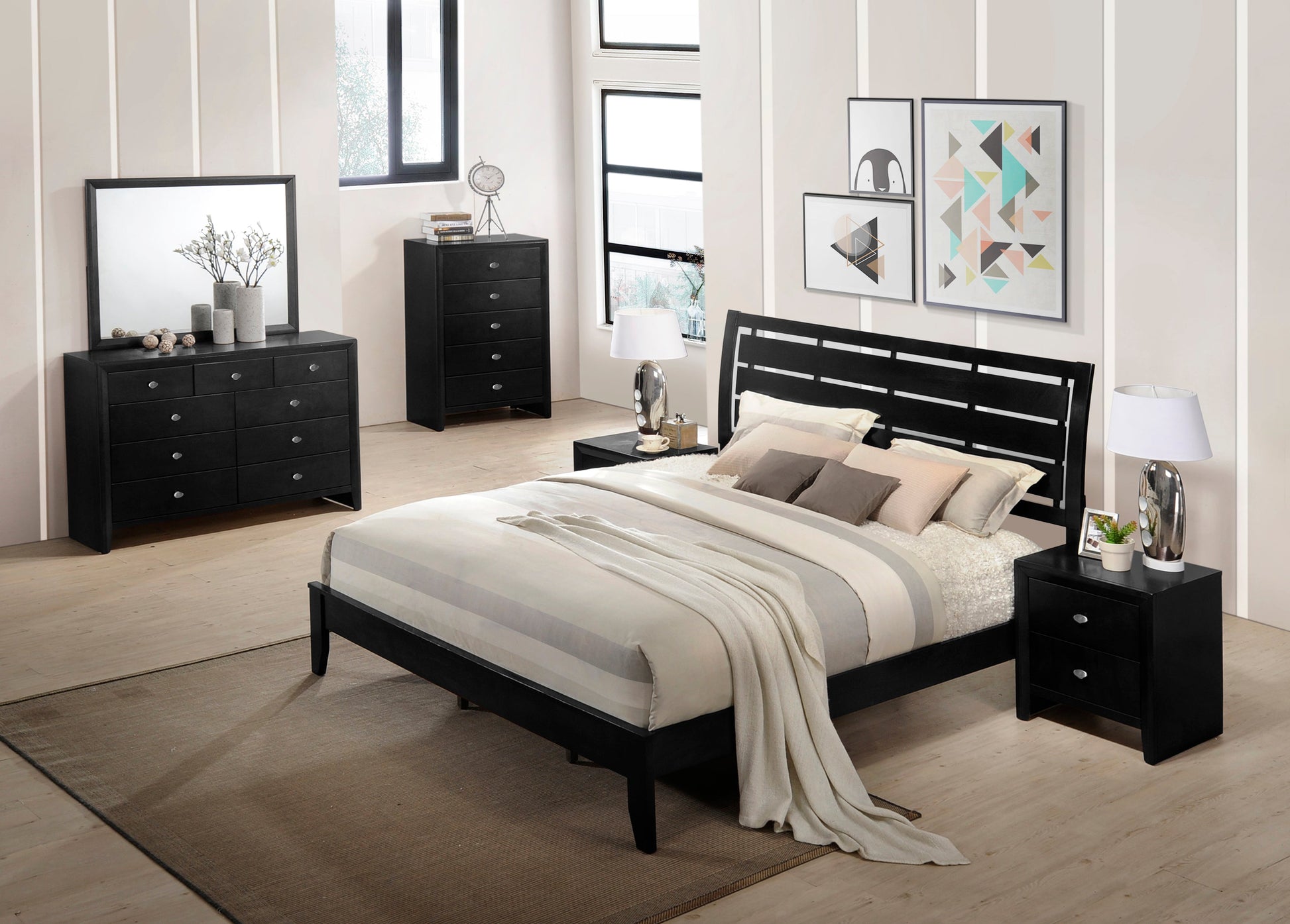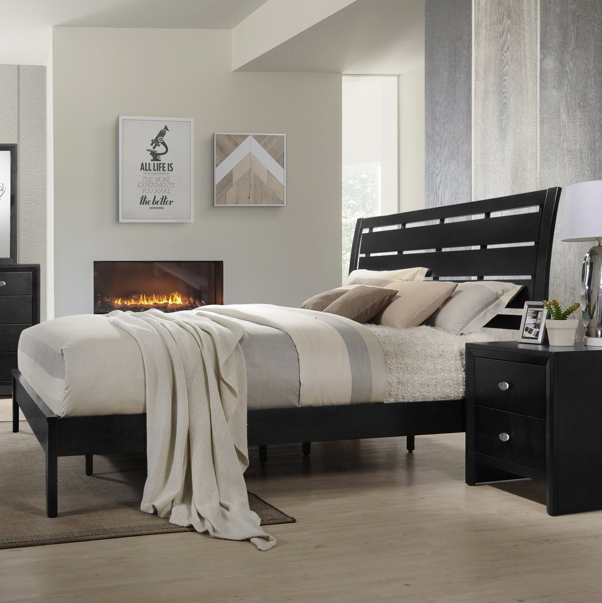 Collapse into comfort when you've got the Gloria Wood Collection. This contemporary bed is crafted with hand-selected woods and veneers in a black finish featuring a modern slatted headboard design. Supported by sturdy tapered legs, it's the perfect place to catch some zzz's at the end of a long day. This bed offers a versatile design with a slatted headboard and a handsome profile.