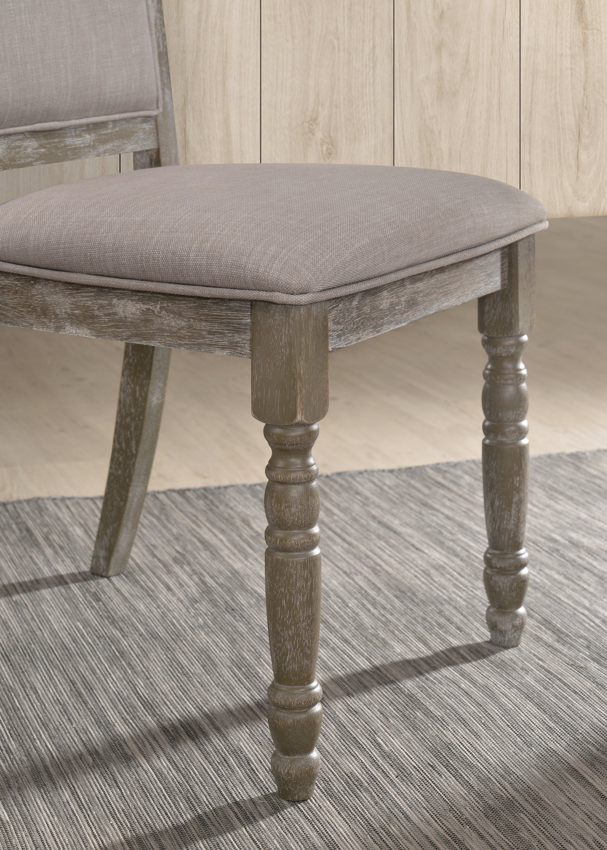 - Durable hardwood construction with a reclaimed gray finish, featuring sturdy turned legs and a distressed undertone.