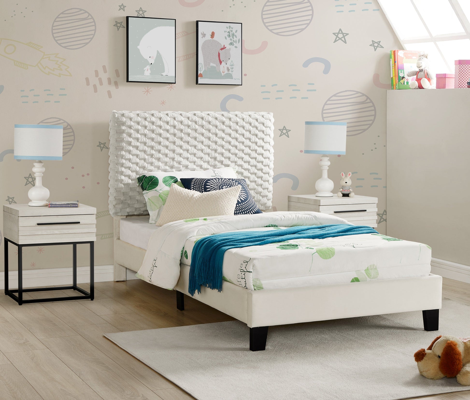 - Headboard features a plush 3D upholstered design in white dove color, adding a sophisticated focal point to any decor.
