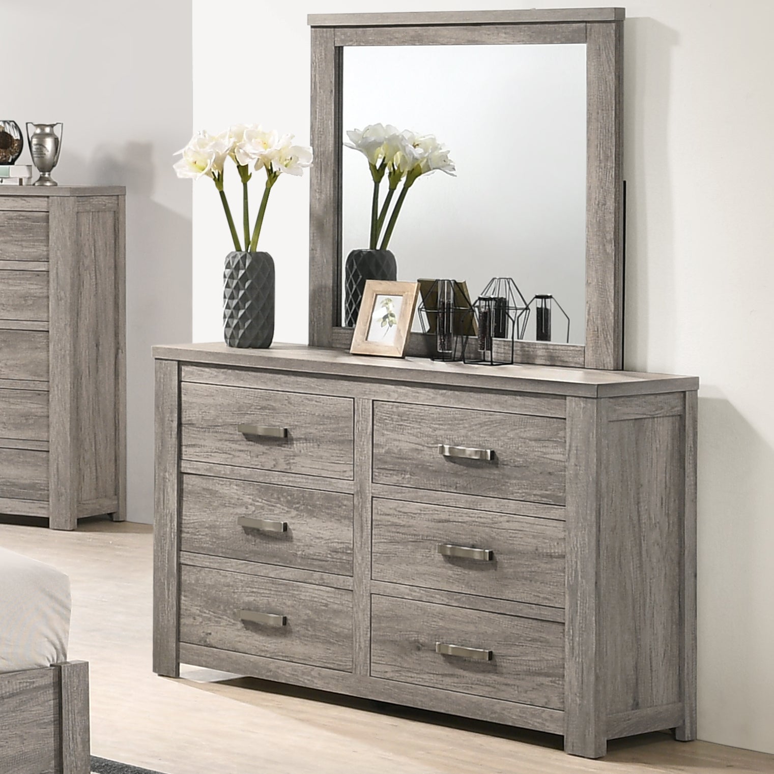 The Floren Contemporary Weathered Gray Wood Bedroom Set features a transitional design that's easy to pair with most decorative plans. Its weather gray finish will add a hint of modern flair to your setting, while also pairing well with most color schemes. The slat-style headboard creates a simple, versatile look. Dresser with wide drawers provides ample storage space for your bedroom. The metal drawer handle features a brushed nickel finish.