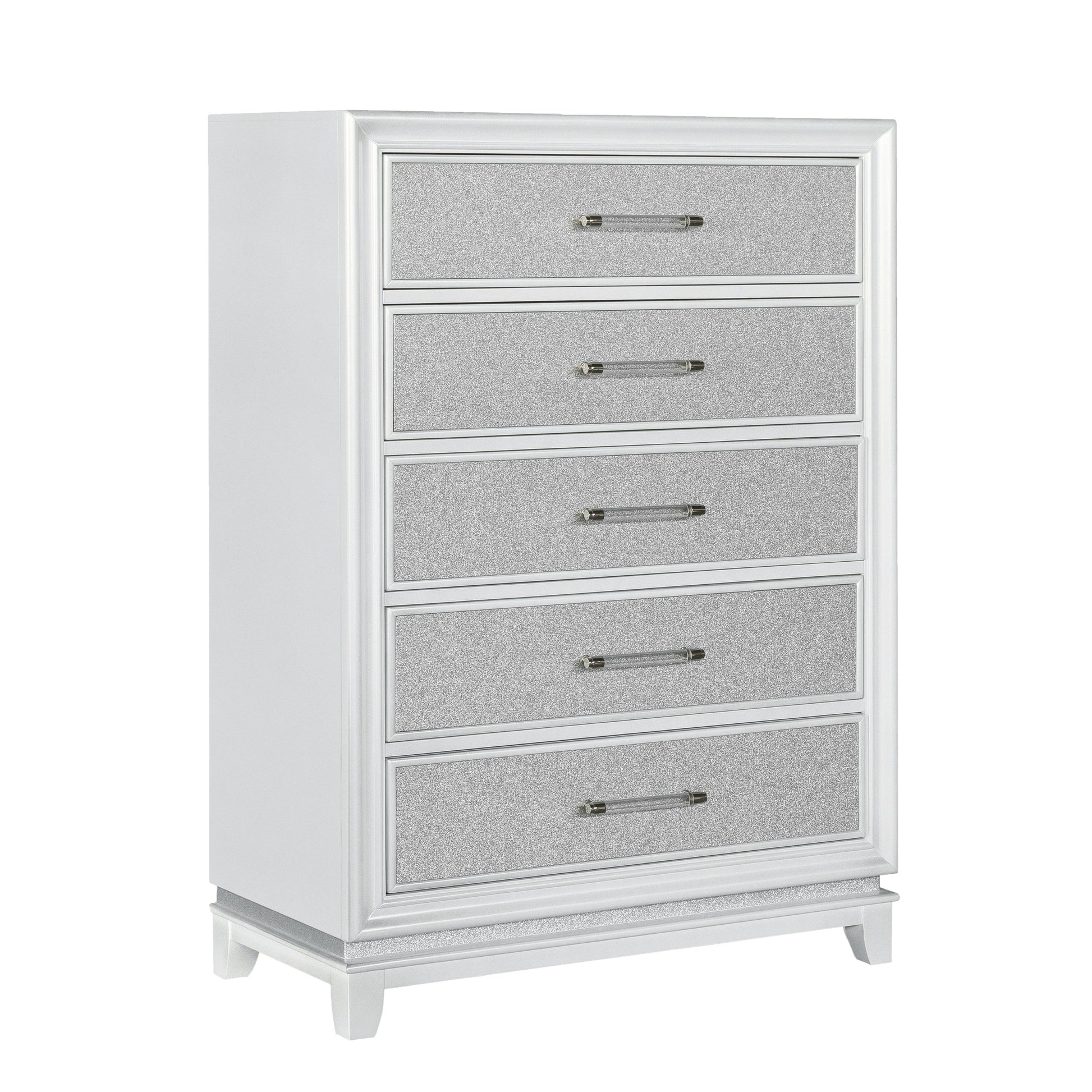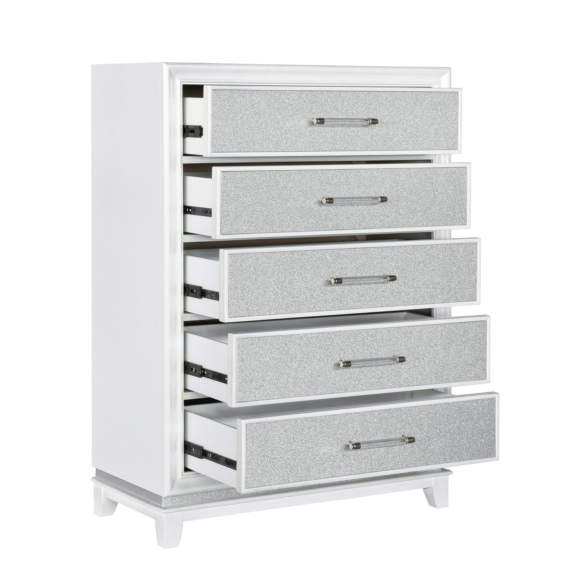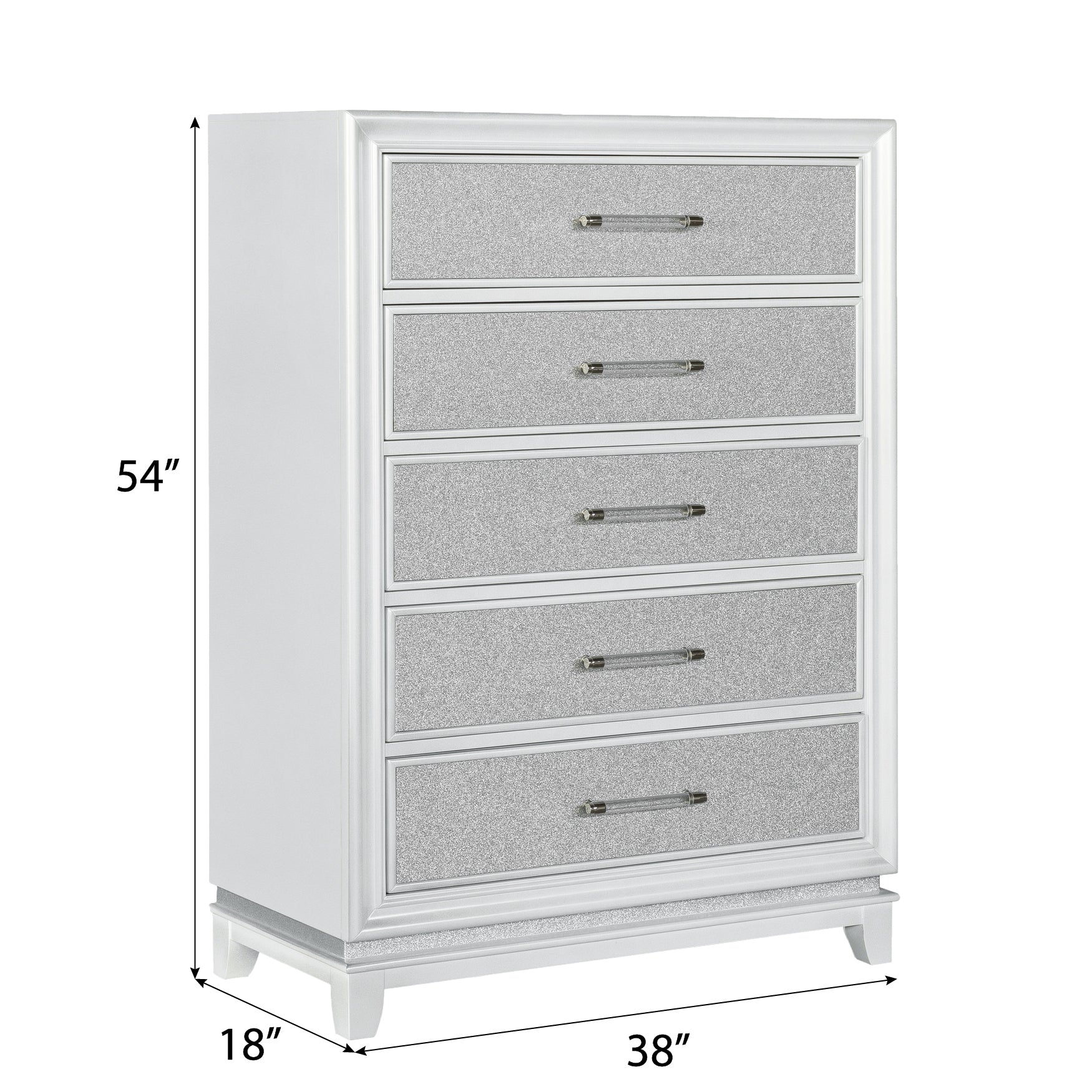 - TIMELESS DESIGN: This exquisite chest showcases a stunning pearlized white finish adorned with glitzy fabric on the drawer fronts, while the back boasts a beautifully painted design. Its sleek and clean lines are enhanced by accents that effortlessly create a striking contrast. With an air of glamour and style, this chest emanates an exceptionally dazzling look that is sure to captivate