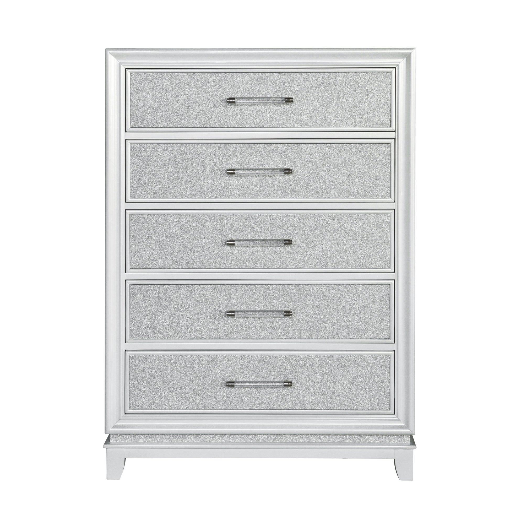 The touch switch-controlled LED lighting in the base rails adds elegance and ensures nighttime safety. The pearlized white finish exudes sophistication, while the sparkly space dust fabric on the drawer fronts creates a captivating and glamorous look. Complete with acrylic and clear pulls, this chest exudes modernity and style. With its five spacious drawers, it provides ample storage space for all your essentials, keeping your belongings organized and easily accessible. Experience the perfect blend of functionality, luxury, and style with this exceptional piece that is sure to make a statement in any bedroom setting. Add the Galaxy Collection to your bedroom for a unique and practical storage solution that complements your interior.