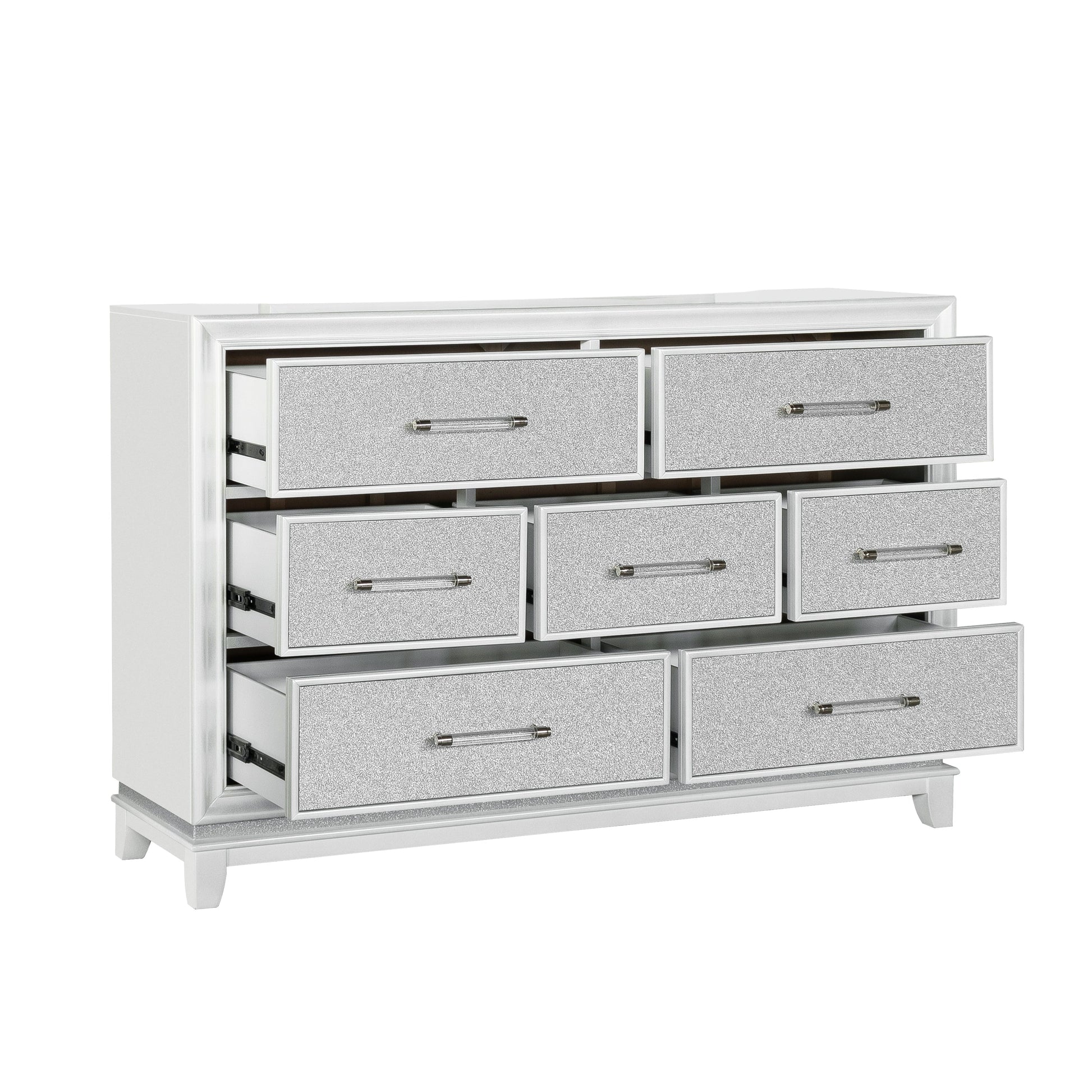 - TIMELESS DESIGN: This exquisite dresser showcases a stunning pearlized white finish adorned with glitzy fabric on the drawer fronts, while the back boasts a beautifully painted design. Its sleek and clean lines are enhanced by accents that effortlessly create a striking contrast. With an air of glamour and style, this dresser emanates an exceptionally dazzling look that is sure to captivate.