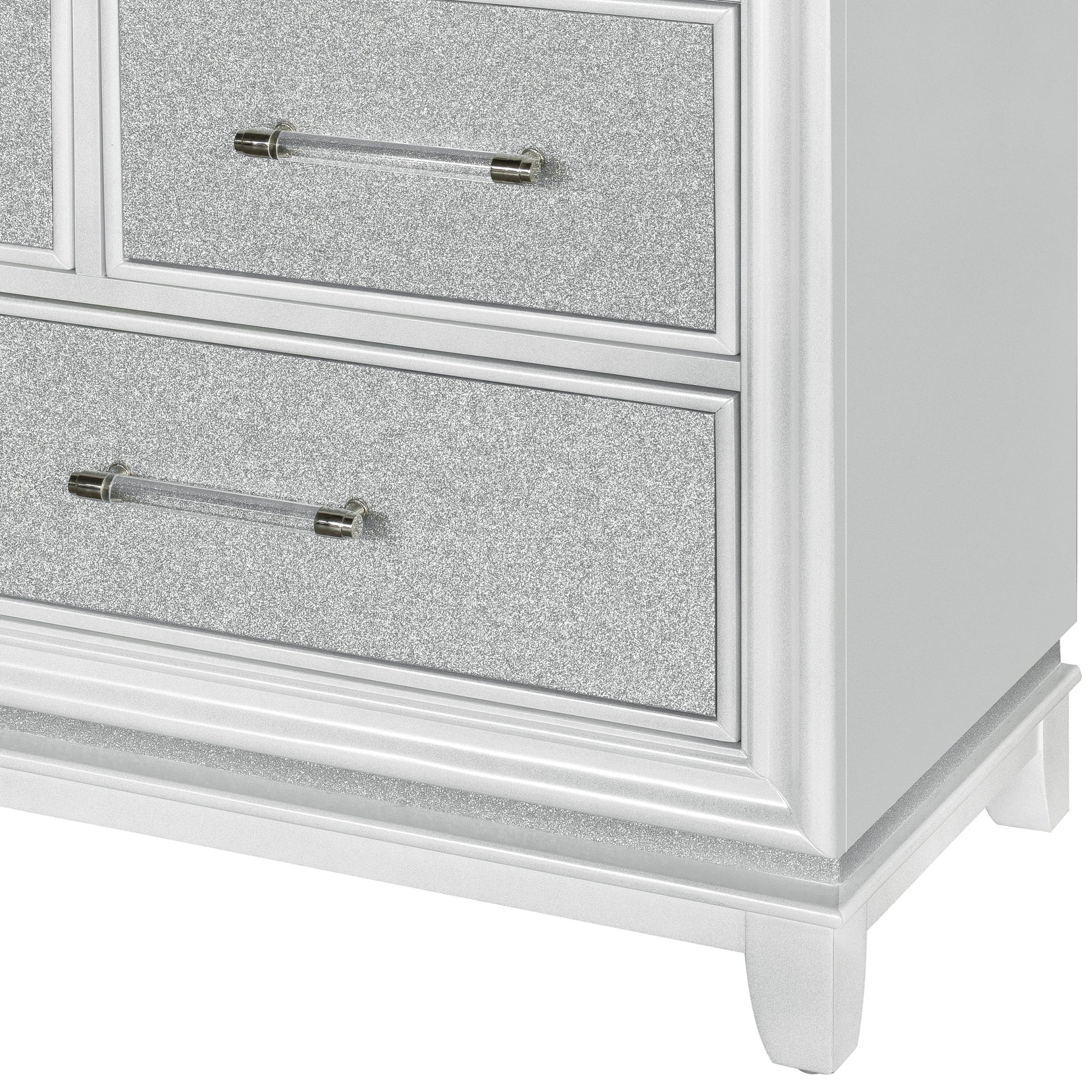 - BUILT TO LAST: The dresser features a robust and time-tested French dovetail construction, with plywood bottoms securely attached to the sides, and smooth-operating metal side guide systems. Long linear acrylic handles add a transitional touch, while tapered block feet provide both aesthetic charm and enhanced stability.