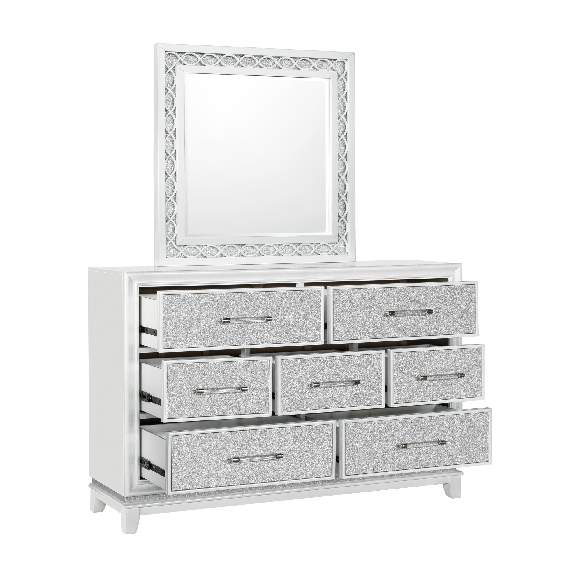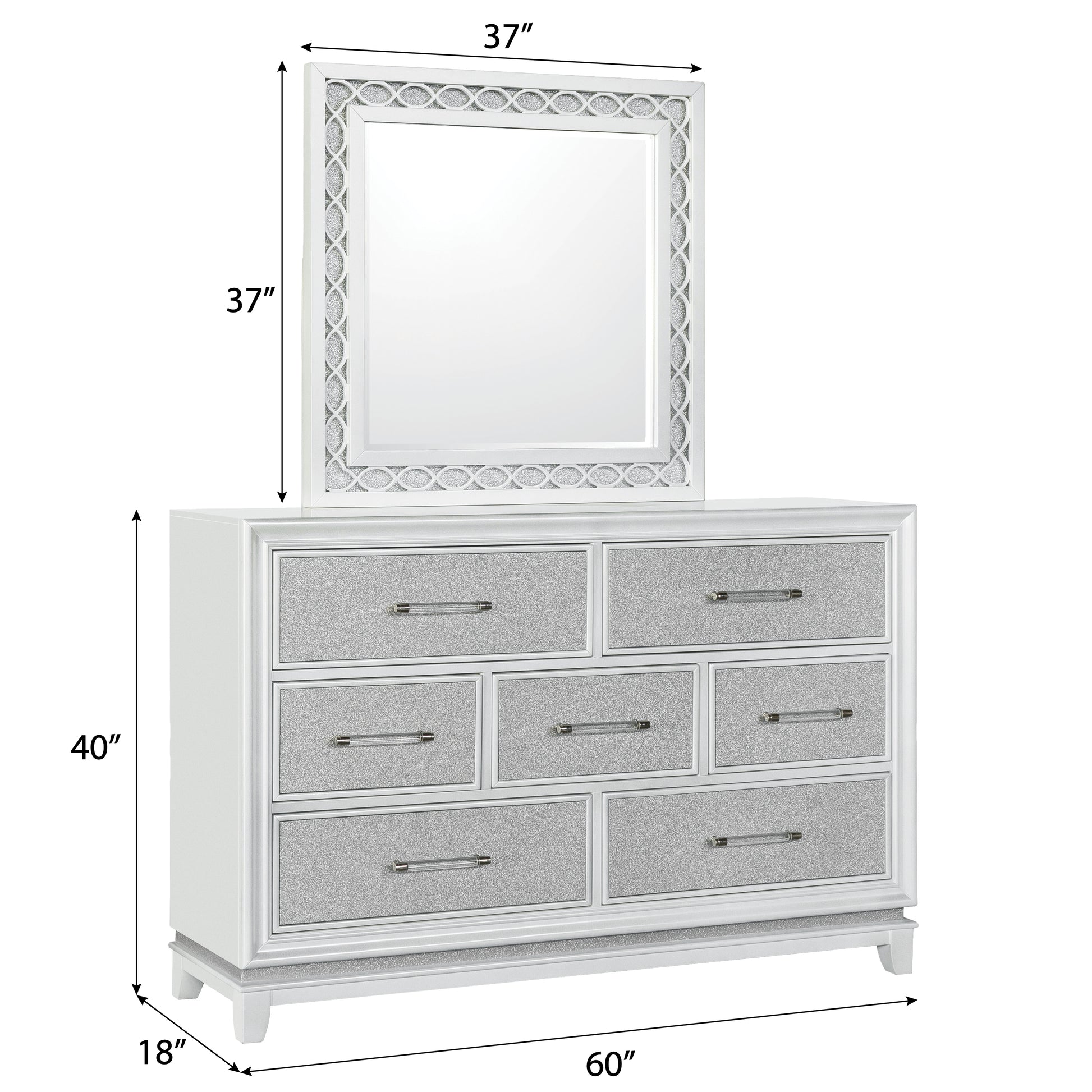 - TIMELESS DESIGN: This exquisite dresser mirror set showcases a stunning pearlized white finish adorned with glitzy fabric on the drawer fronts, while the back boasts a beautifully painted design. Its sleek and clean lines are enhanced by accents that effortlessly create a striking contrast. With an air of glamour and style, this set emanates an exceptionally dazzling look that is sure to captivate.