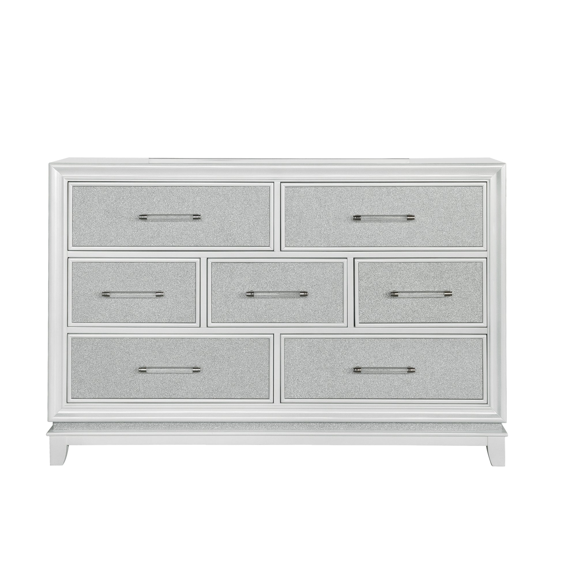 This bedroom dresser comes with a matching mirror it features 7 large drawers with sleek lines in a simple and elegant pattern. The touch switch-controlled LED lighting in the base rails adds elegance and ensures nighttime safety. The pearlized white finish exudes sophistication, while the sparkly space dust fabric on the drawer fronts creates a captivating and glamorous look. Complete with acrylic and clear pulls, this dresser mirror set exudes modernity and style. With its seven spacious drawers, it provides ample storage space for all your essentials, keeping your belongings organized and easily accessible. Experience the perfect blend of functionality, luxury, and style with this exceptional piece that is sure to make a statement in any bedroom setting. Add the Galaxy Collection to your bedroom for a unique and practical storage solution that complements your interior.