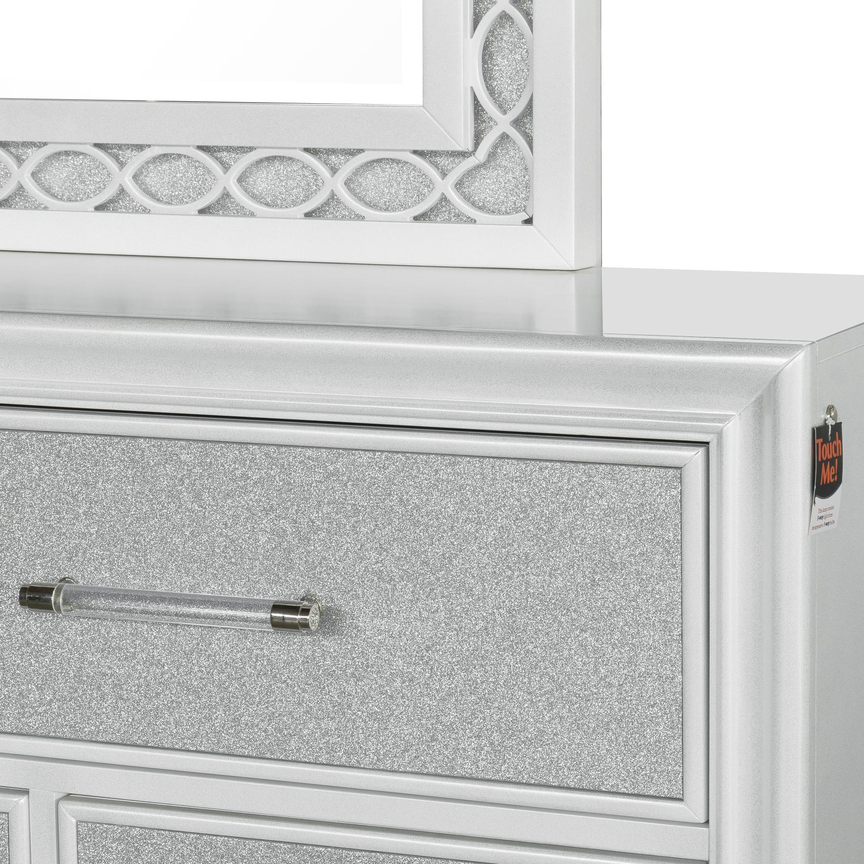 This bedroom dresser comes with a matching mirror it features 7 large drawers with sleek lines in a simple and elegant pattern. The touch switch-controlled LED lighting in the base rails adds elegance and ensures nighttime safety. The pearlized white finish exudes sophistication, while the sparkly space dust fabric on the drawer fronts creates a captivating and glamorous look. Complete with acrylic and clear pulls, this dresser mirror set exudes modernity and style. With its seven spacious drawers, it provides ample storage space for all your essentials, keeping your belongings organized and easily accessible. Experience the perfect blend of functionality, luxury, and style with this exceptional piece that is sure to make a statement in any bedroom setting. Add the Galaxy Collection to your bedroom for a unique and practical storage solution that complements your interior.