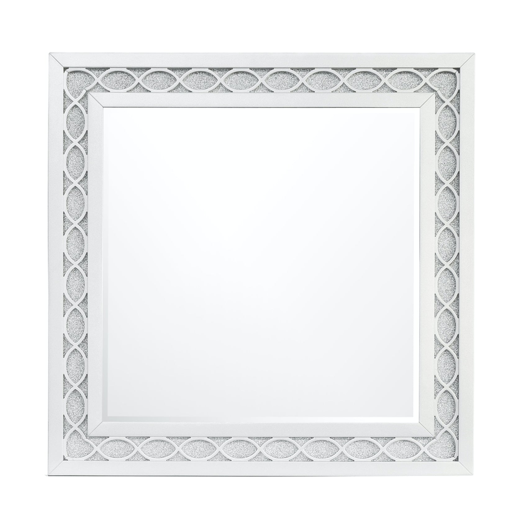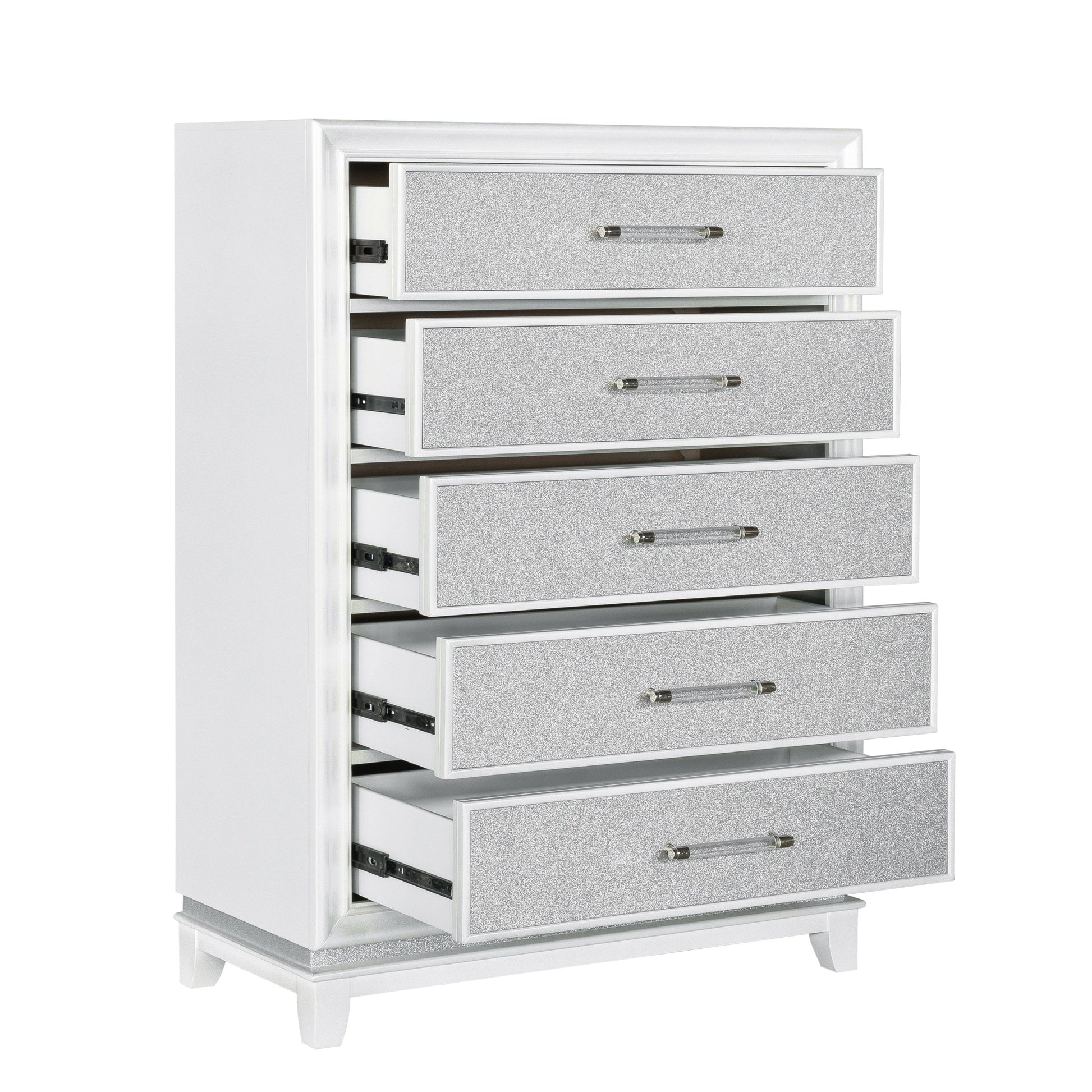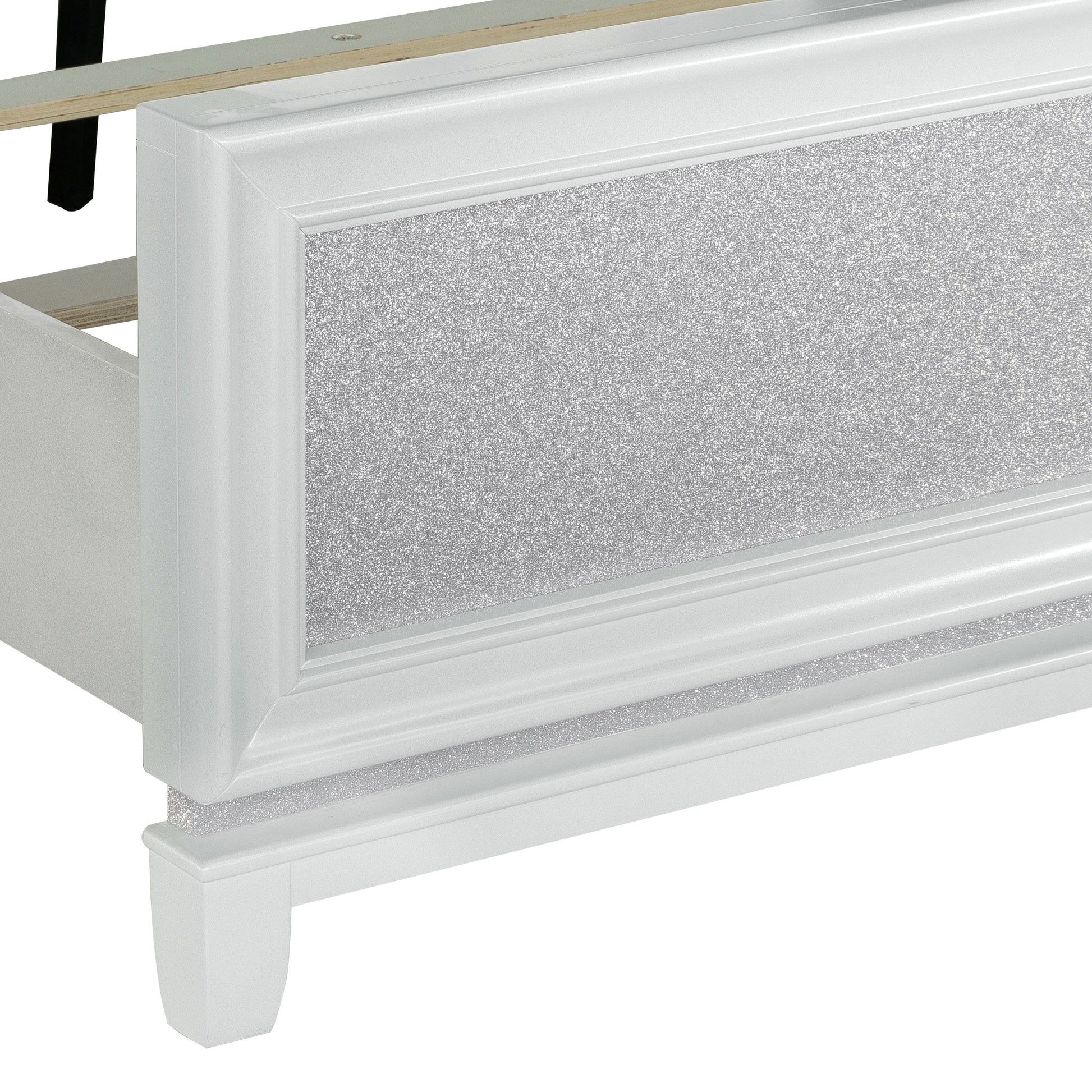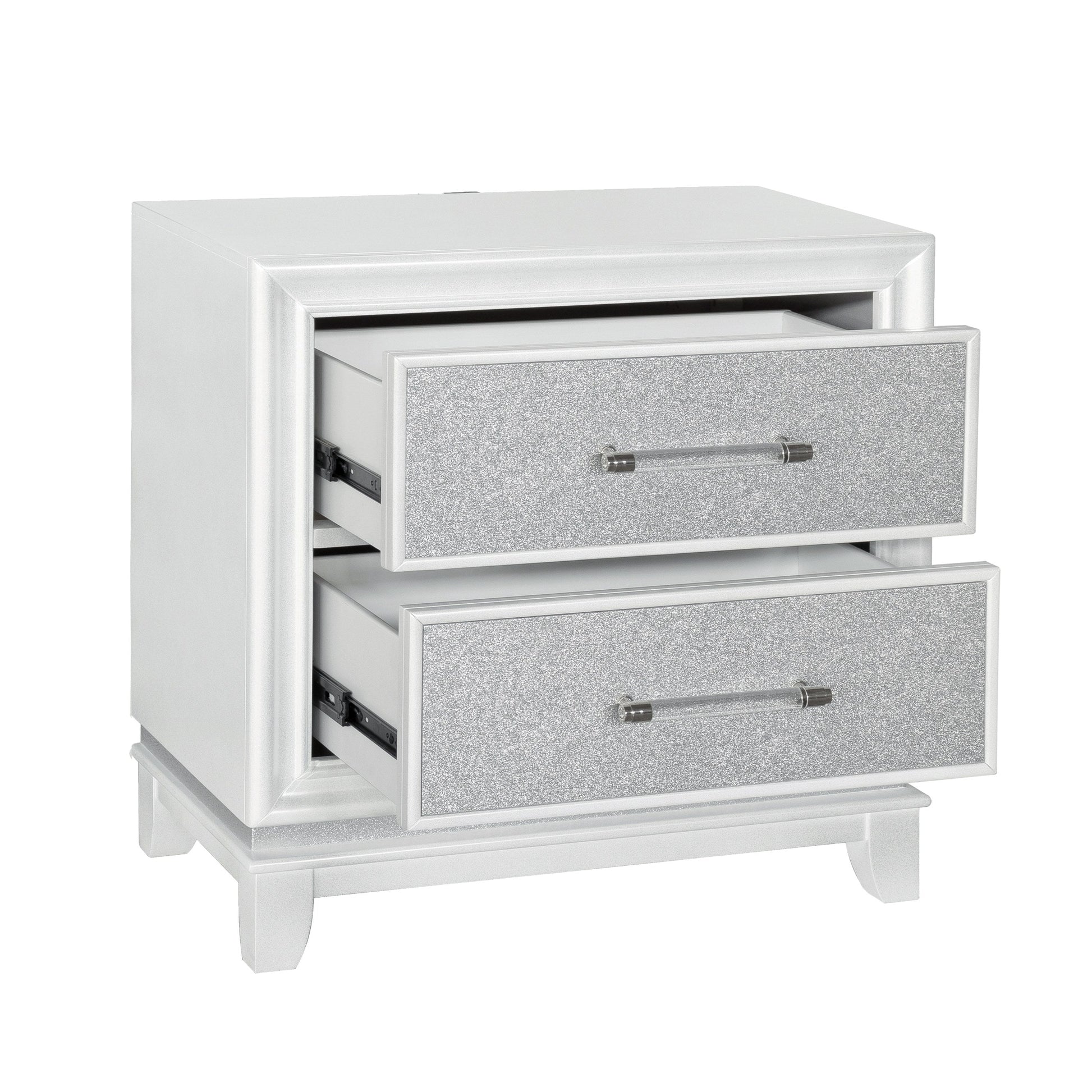 - PEARLIZED WHITE FINISH: This set has a pearlized white finish and sparkling "space dust" accents for a celestial-inspired look. It completes the set with its convenient storage solution for your essentials while adding a touch of elegance to your bedroom.