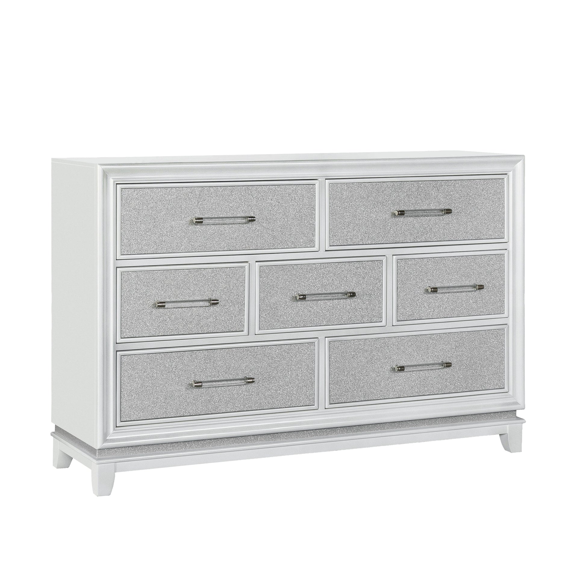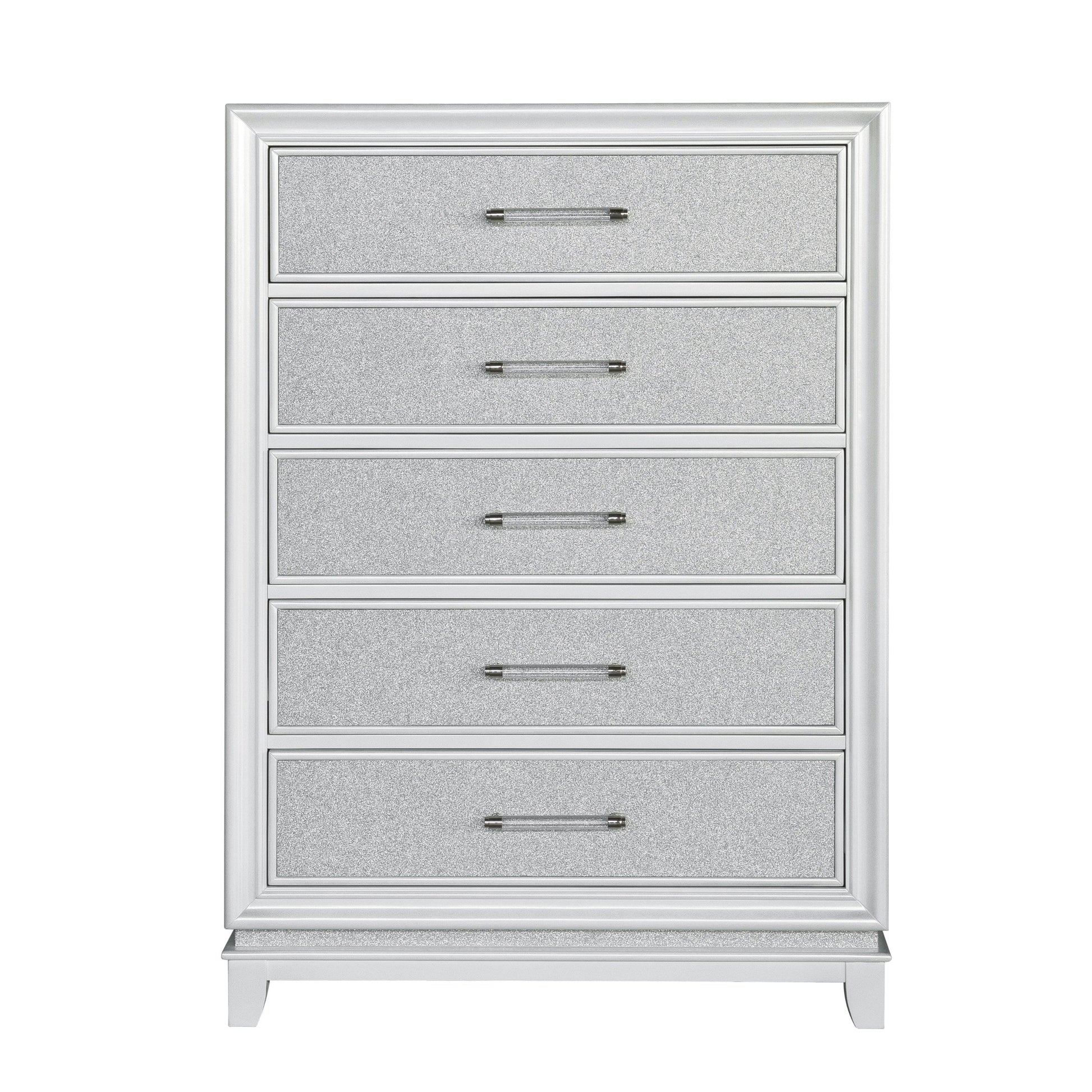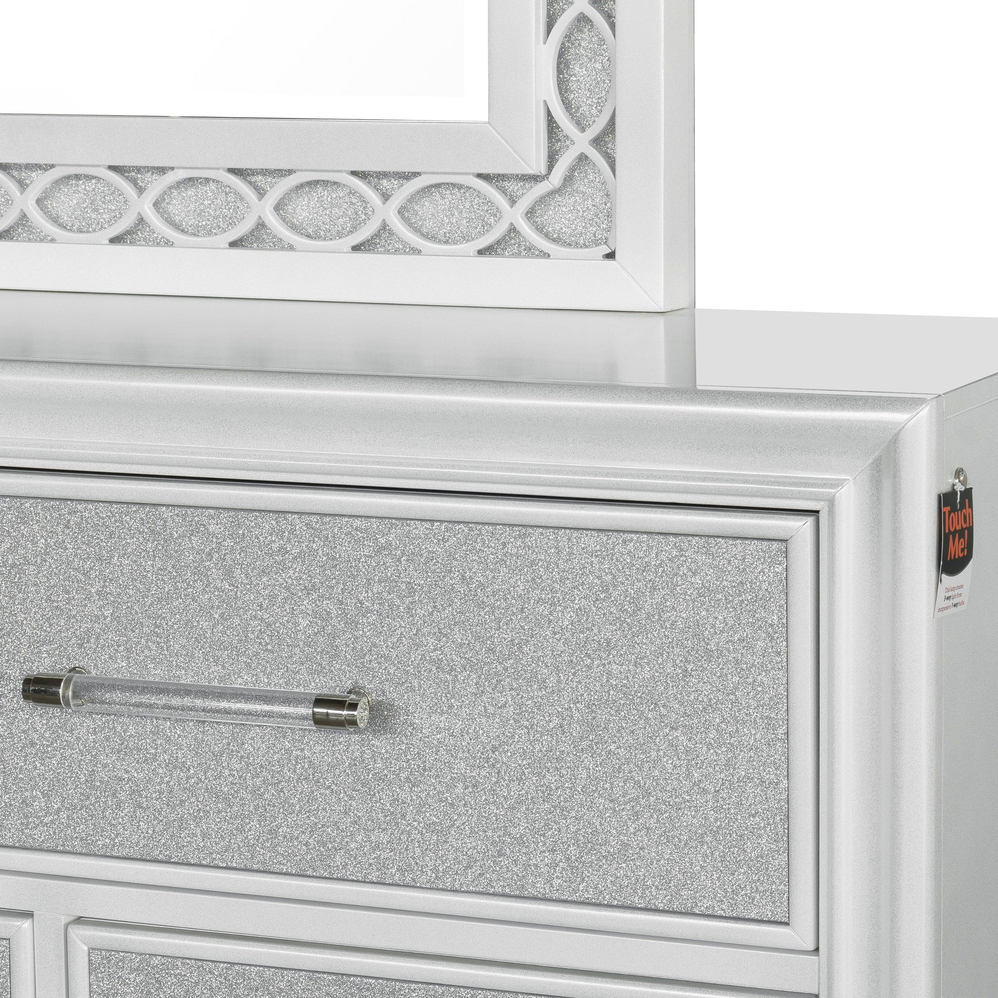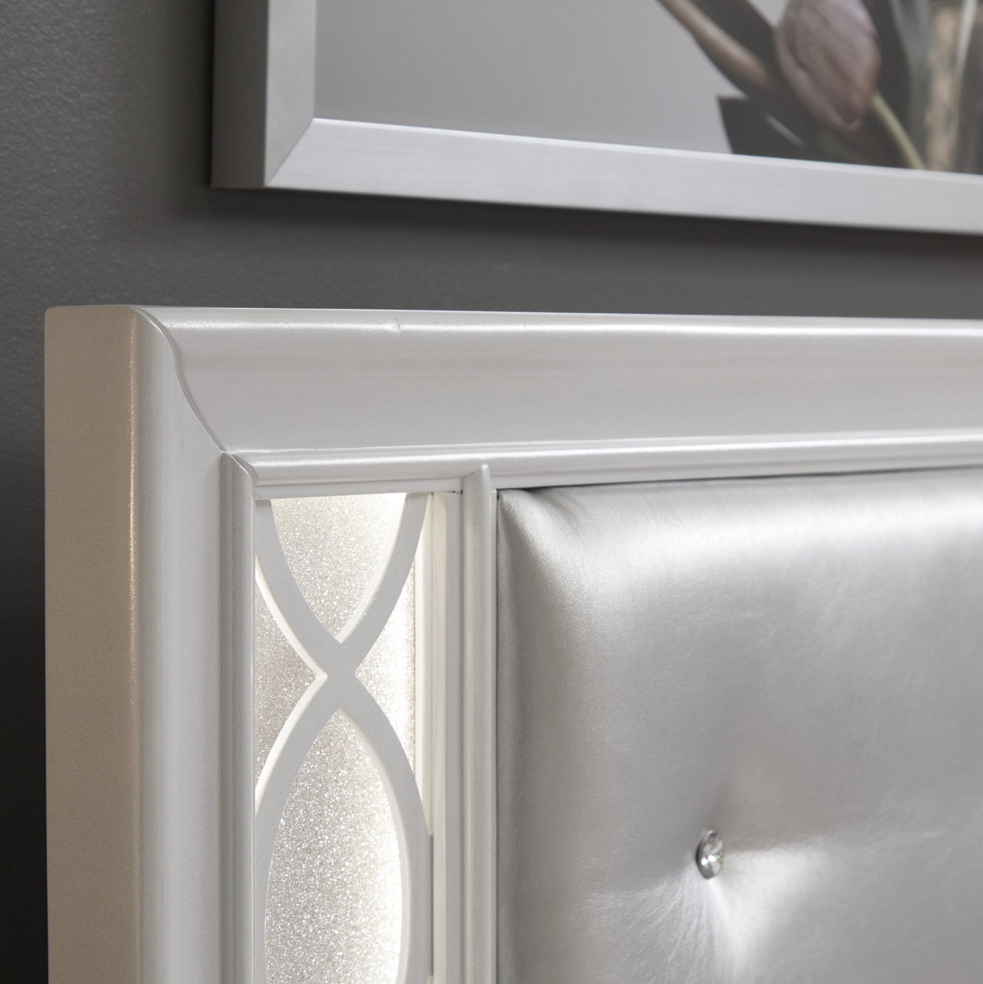 The upholstered panel bed features a sleek silhouette with a tufted headboard in stunning silver fabric. The LED lighting on each side of the headboard and in the base rails of each piece creates a warm and inviting ambiance. The 7-drawer dresser and matching mirror feature sleek lines with ample storage space and modern acrylic and clear pulls. The 2-drawer nightstand and 5-drawer chest completes the set with its convenient storage for your essentials while adding a touch of elegance to your bedroom.