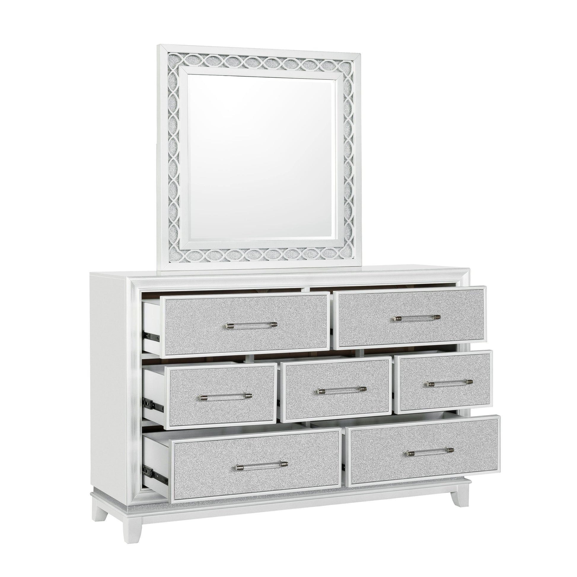 Introducing the exquisite Galaxy Bedroom Collection with LED Lights in Pearlized White from Roundhill Furniture. The collection includes an upholstered panel bed, a 7-drawer dresser, a mirror, 2-drawer nightstand, and chest. The set features touch switch-controlled LED lighting for a warm ambiance. It is crafted from high-quality MDF and poplar solids with a pearlized white finish and sparkling "space dust" fabric accents for a celestial-inspired look.