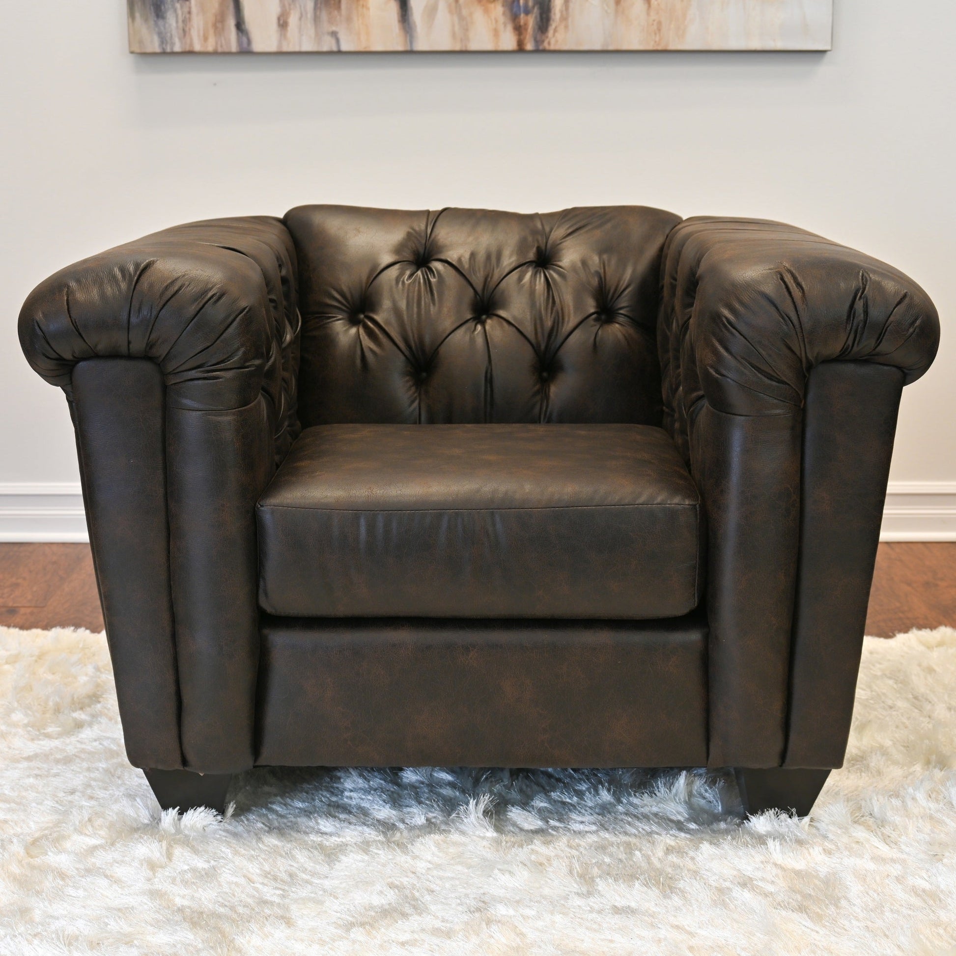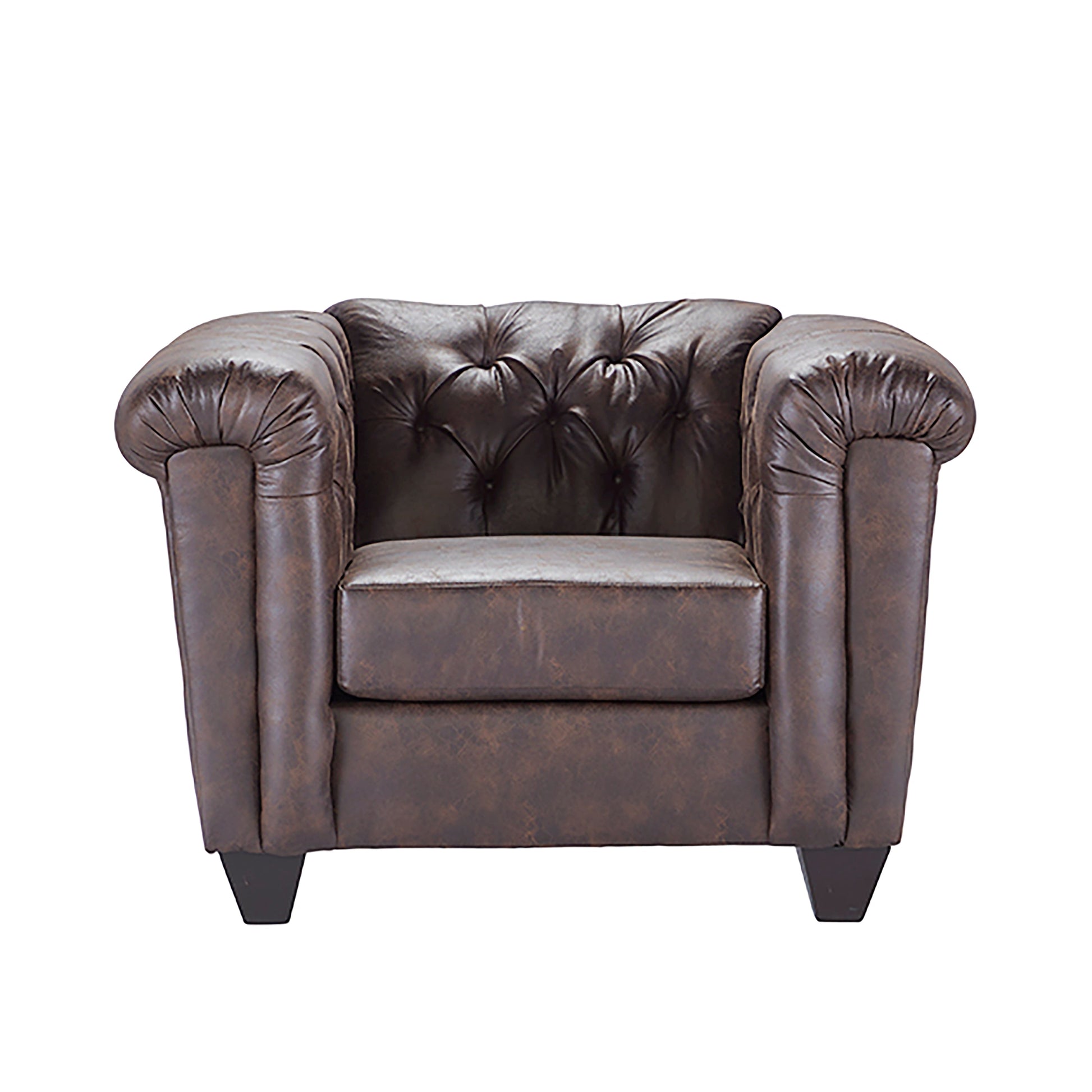 - ? BUTTON TUFTING: This stunning arm chair showcases exquisite craftsmanship with its brownie faux leather upholstery, adding a touch of timeless to any living space. The hand-tailored button tufting on the back delivers its sophisticated appeal, creating a visually appealing focal point.