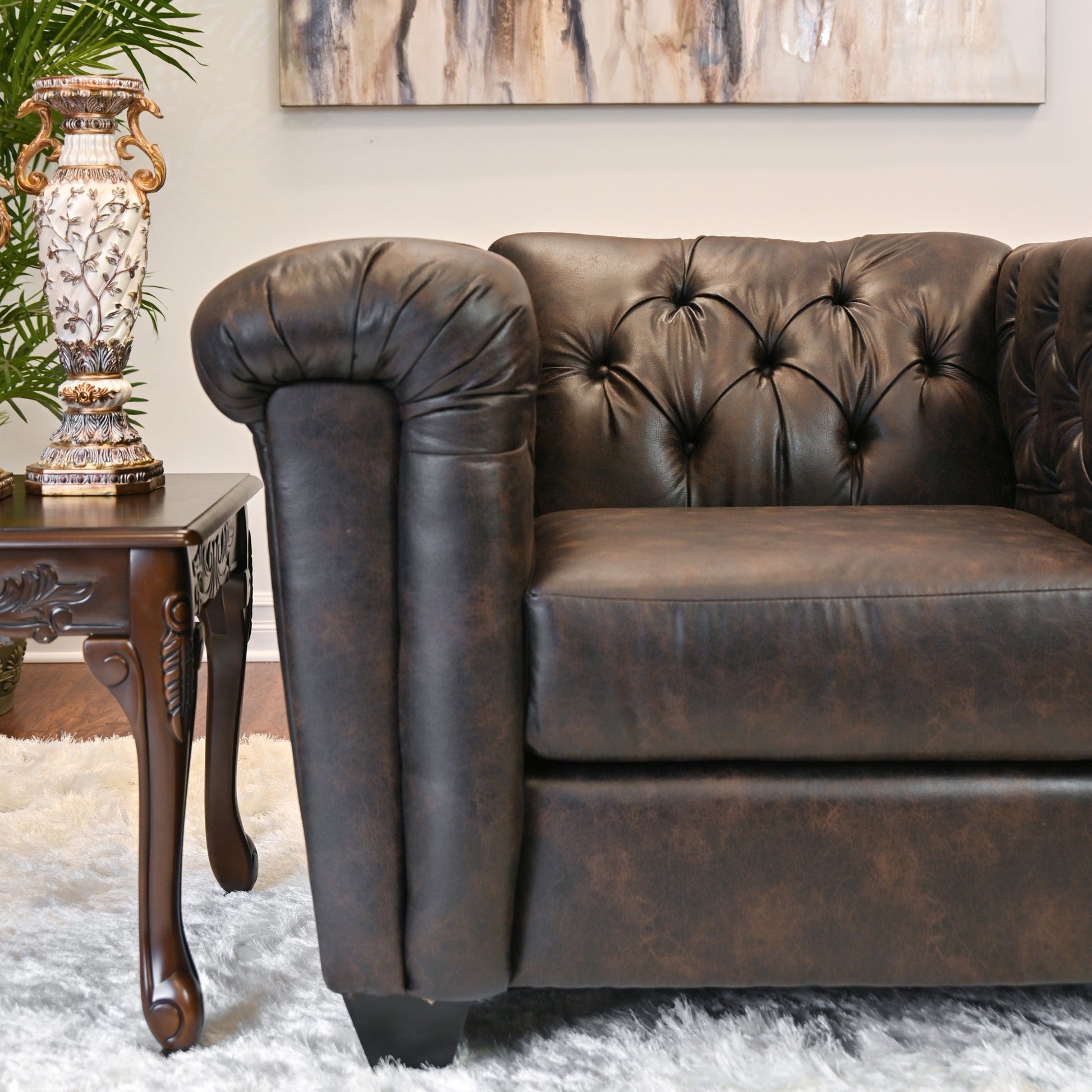 Introducing the exquisite Roundhill Furniture Horton Faux Leather Chesterfield Armchair in captivating Brownie. Crafted with a robust hardwood frame, this armchair exudes enduring luxury. Meticulously hand-tailored button tufting and high-density cushions provide enhanced support and unrivaled coziness. Every moment on this brownie armchair is a sensory delight, enveloping you in relaxation and tranquility. The sleek tuxedo arm style adds modern elegance, making it a captivating centerpiece that complements any decor.