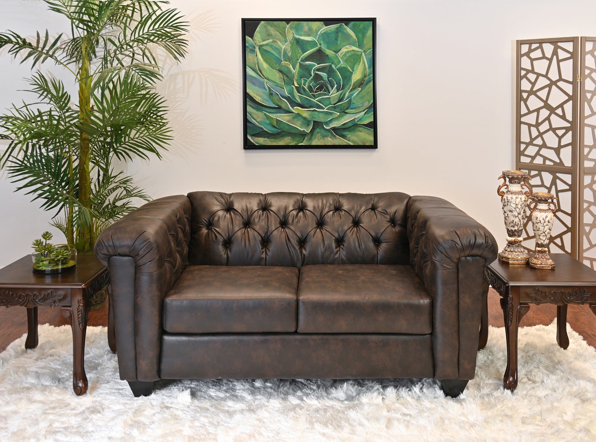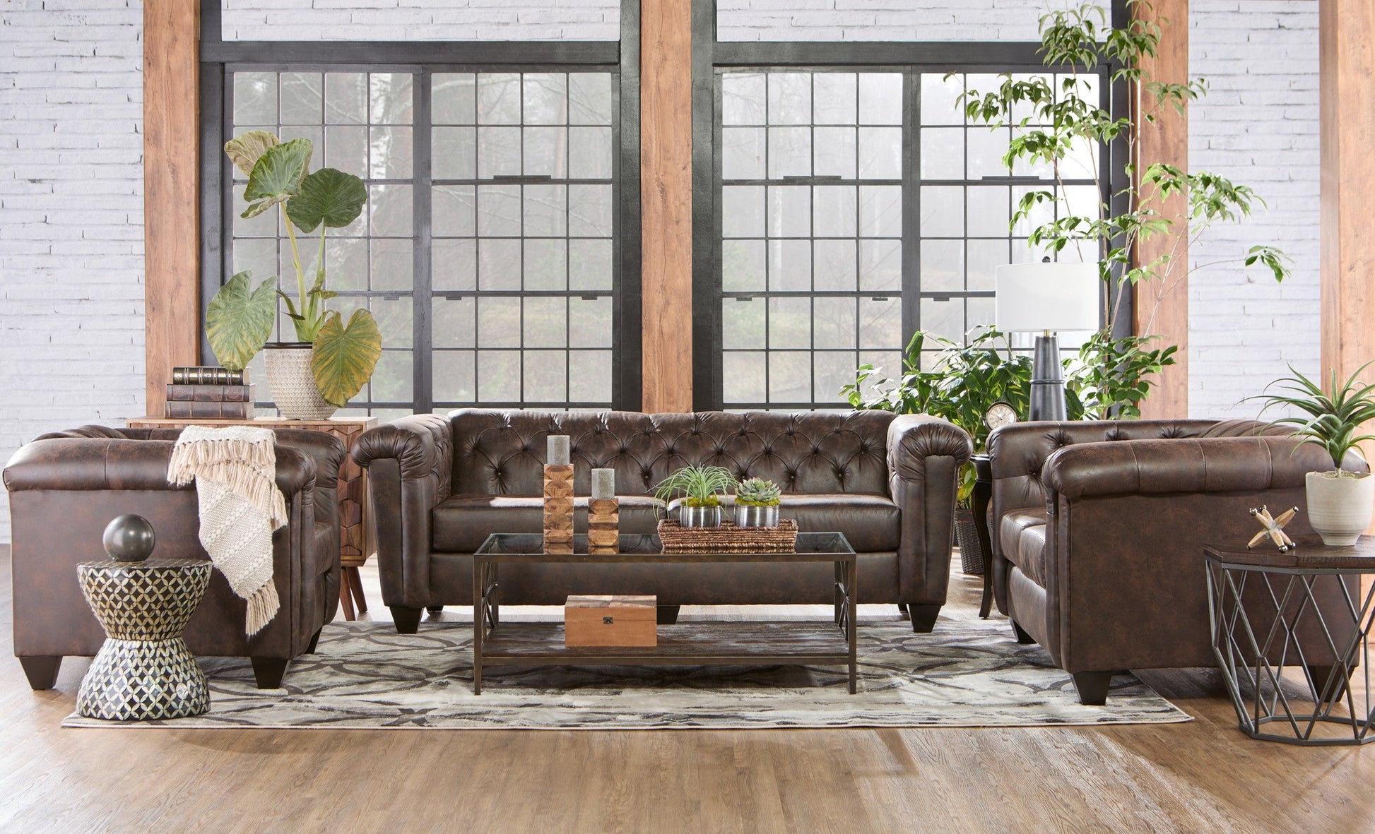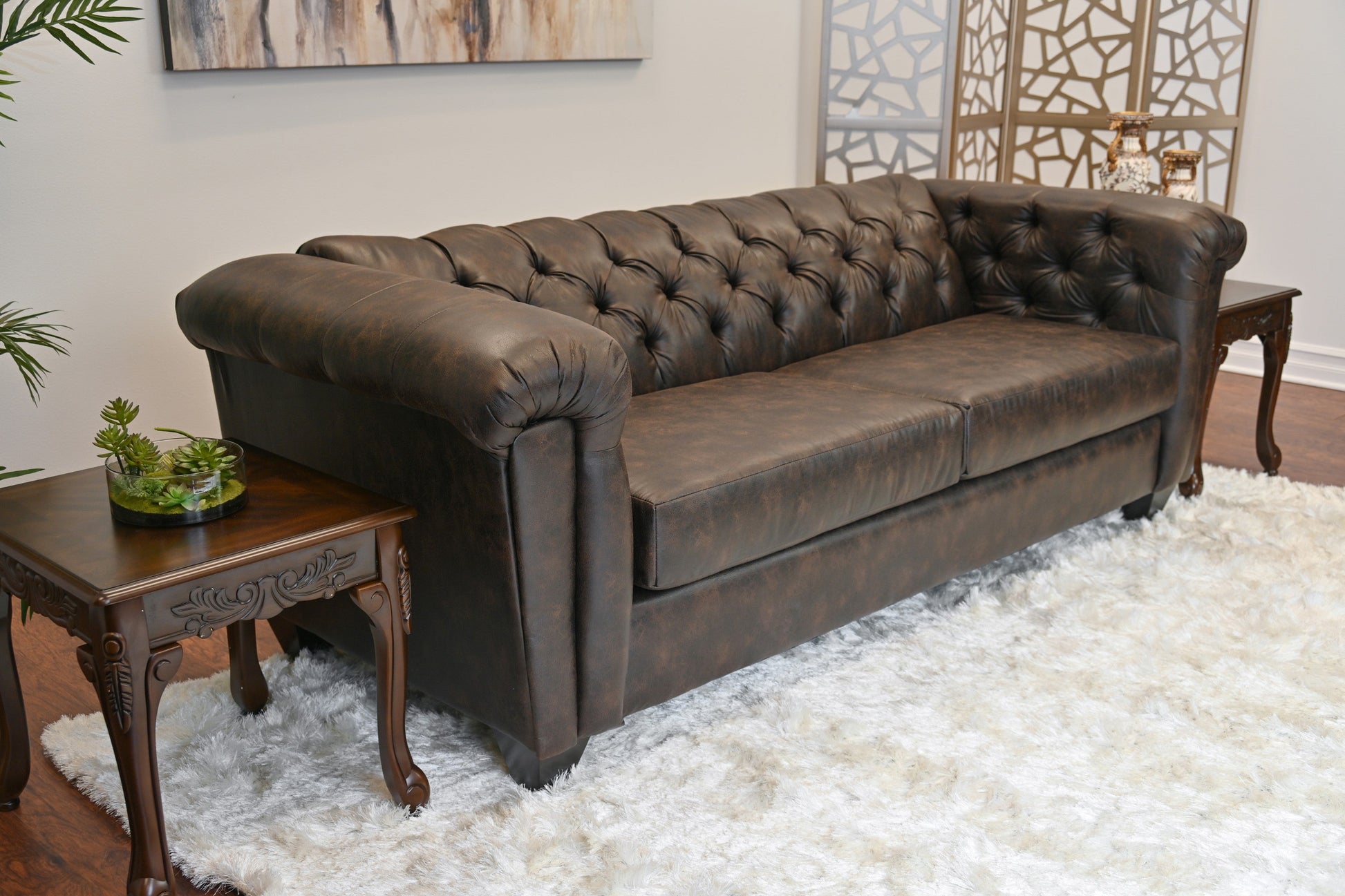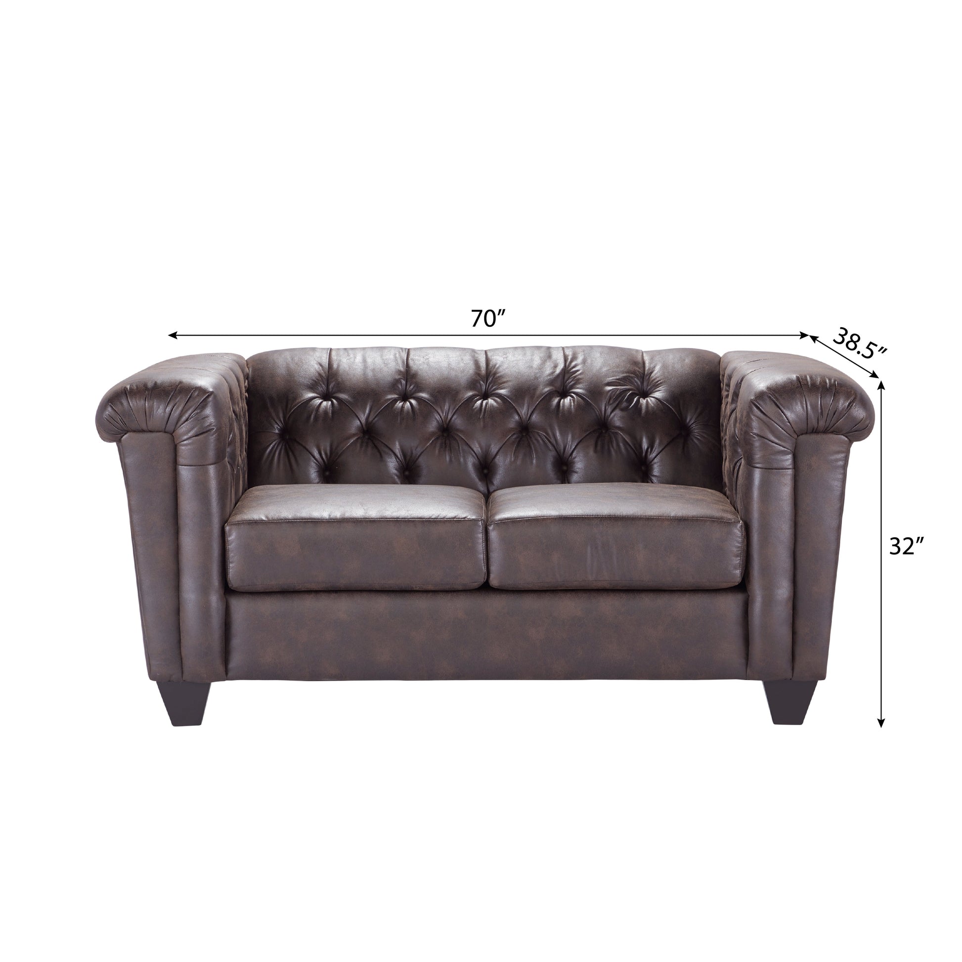 - ? CHESTERFIELD DESIGN: This set boasts a modern tuxedo arm design, characterized by its straight and clean lines that run parallel to the backrest, creating a boxy silhouette that exudes transitional sophistication. The brownie faux leather upholstery adds a touch of relaxation, while the hand-tailored button tufting on the back creates a visually appealing focal point.
