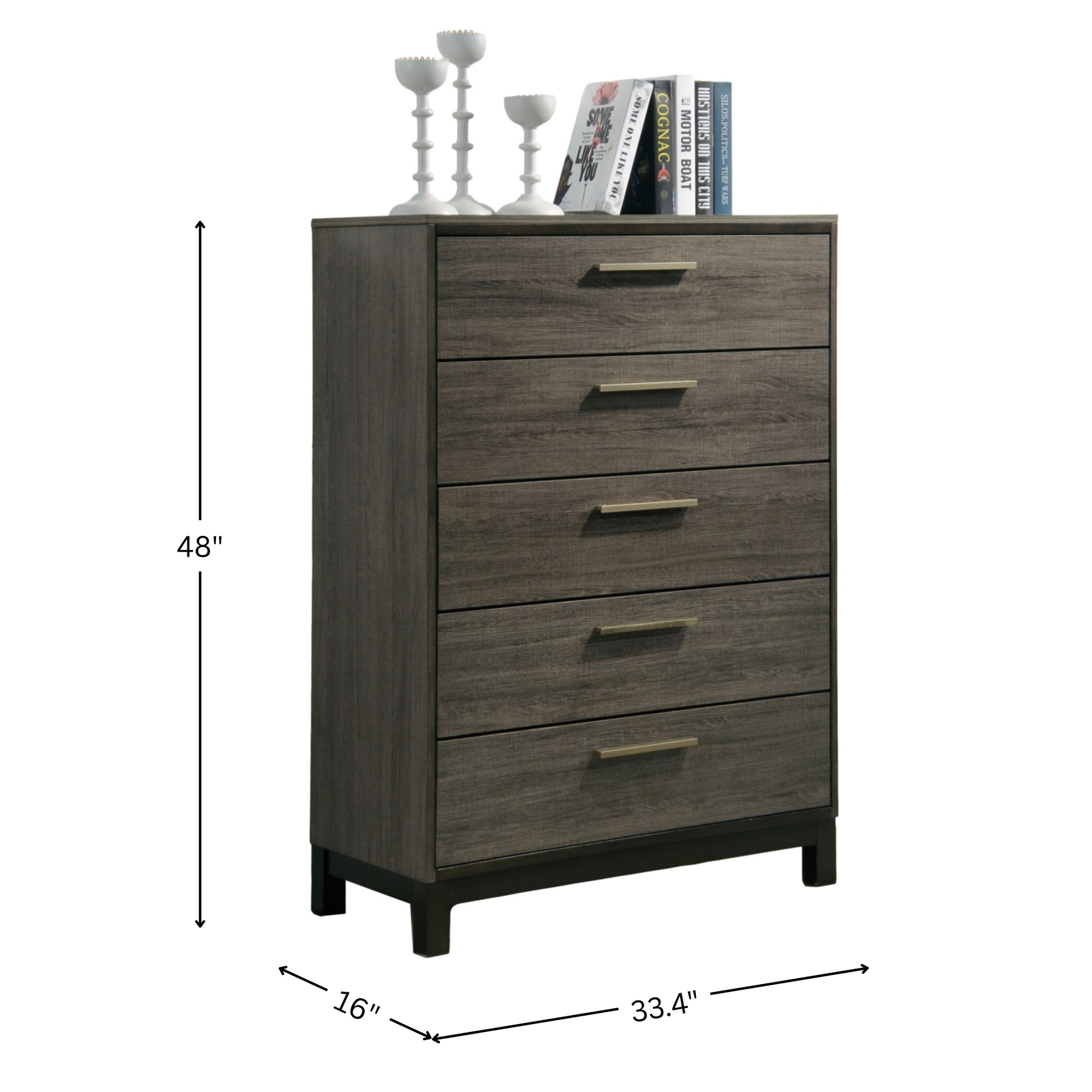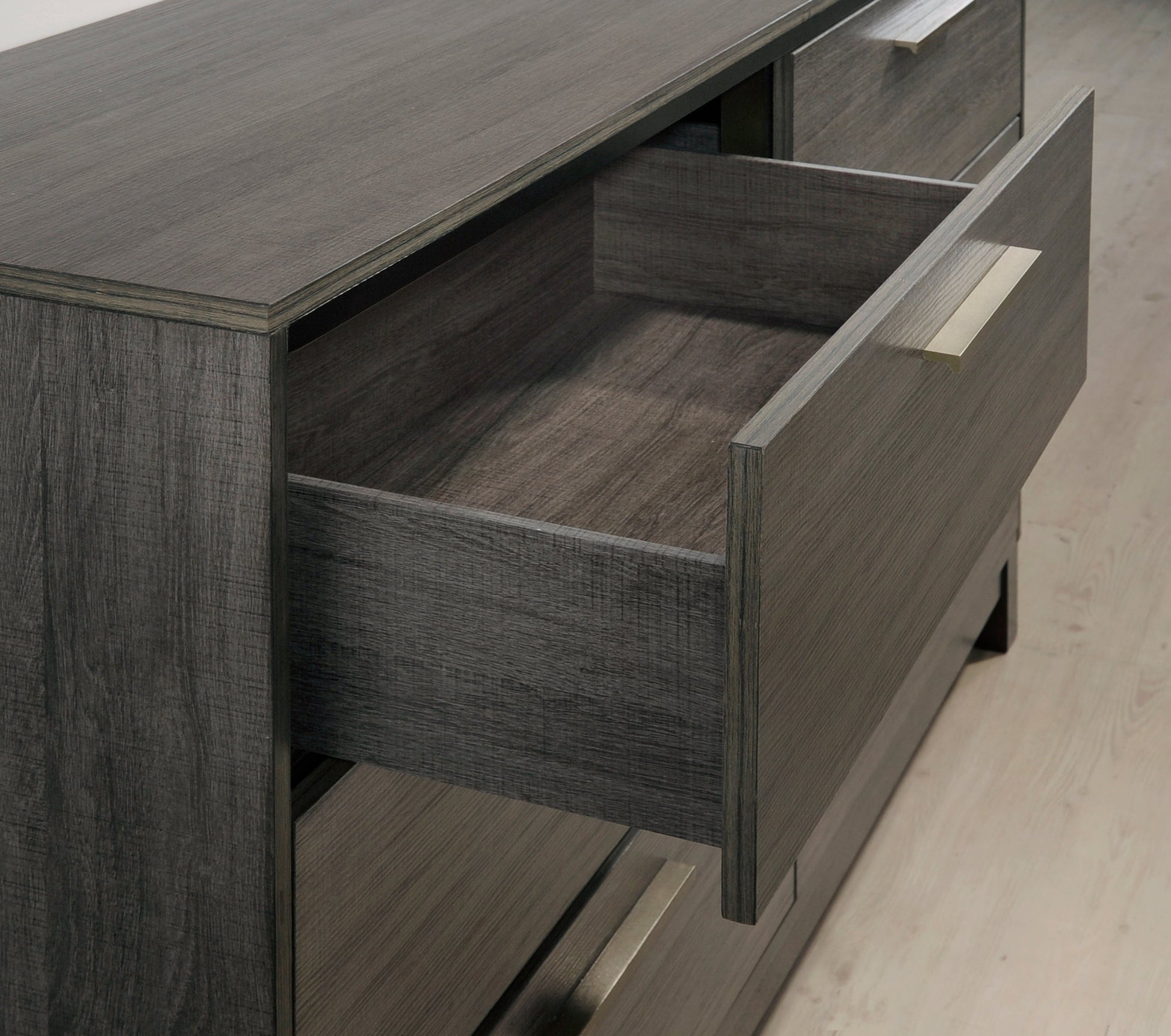- The weathered gray finish enhances the wood veneer while sleek hardware lends to the authenticity of its modern appeal.