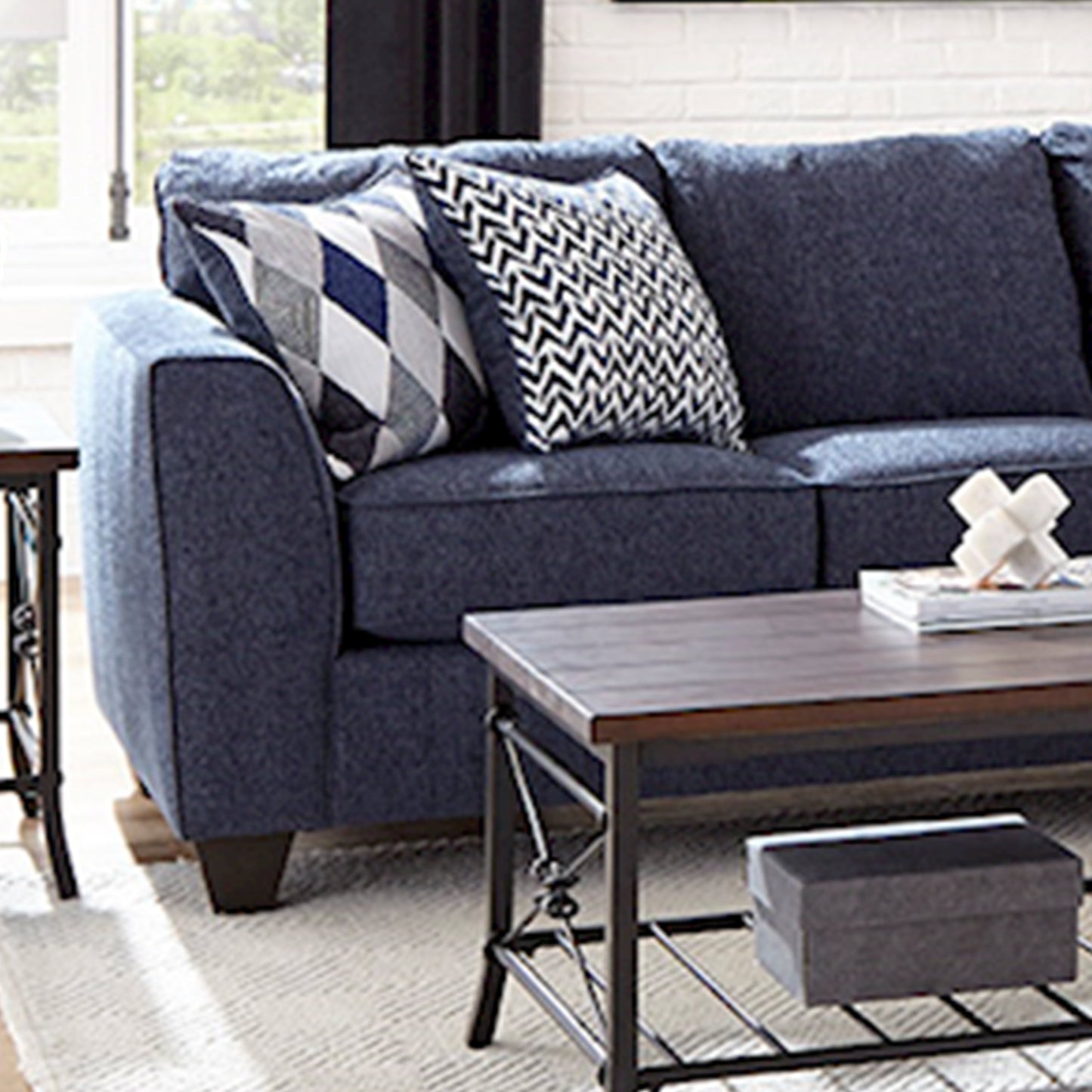 - Beautiful, rich indigo color fabric upholstery and matching throw pillows are included for a pleasing contrast
