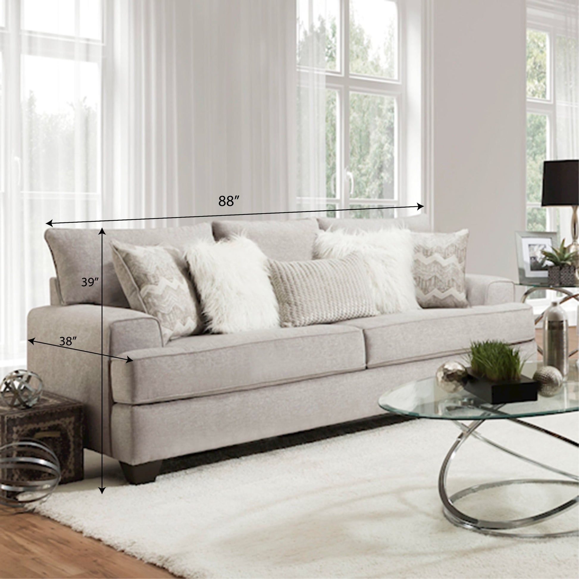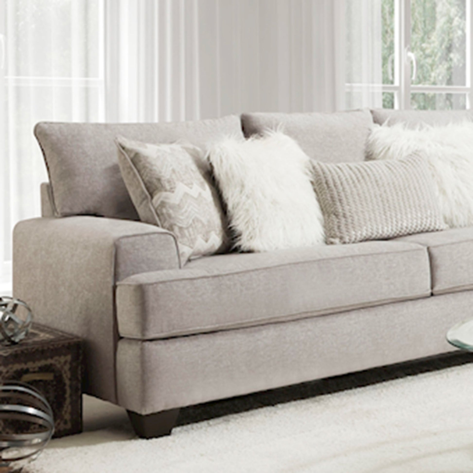 - Welt trim along the back, arm, and seat. The patterned pillow, lumbar pillow, and faux fur throw pillows are included for a pleasing contrast