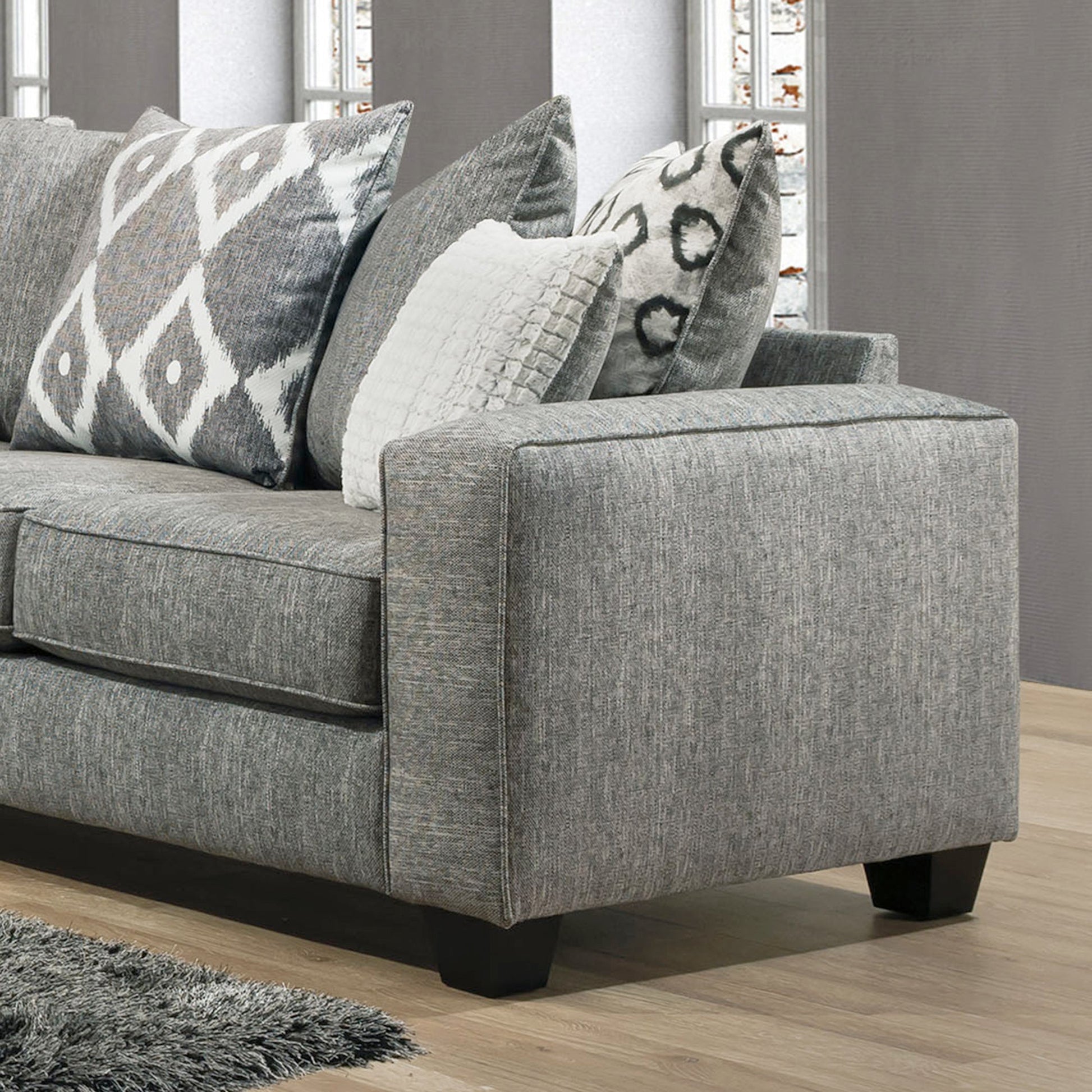 Bring extra comfort to your living space with the Vila Weathered Gray Fabric Pillow Back Sofa and retain your sense of modern style as well. This sofa is constructed from long-lasting and solid and engineered wood with block black plastic feet for support. A handsome and chic medium-gray polyester fabric upholsters the piece. Every inch of the frame and cushions are padded with soft foam, while the cushions feature springs for support and comfort. This sofa features pillow backs for extra comfort, the matching throw pillows are all included.