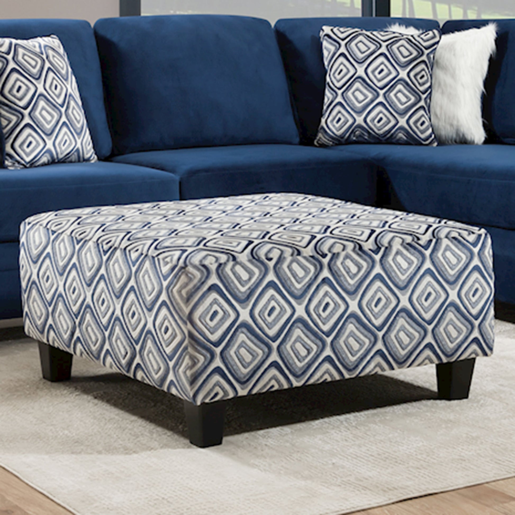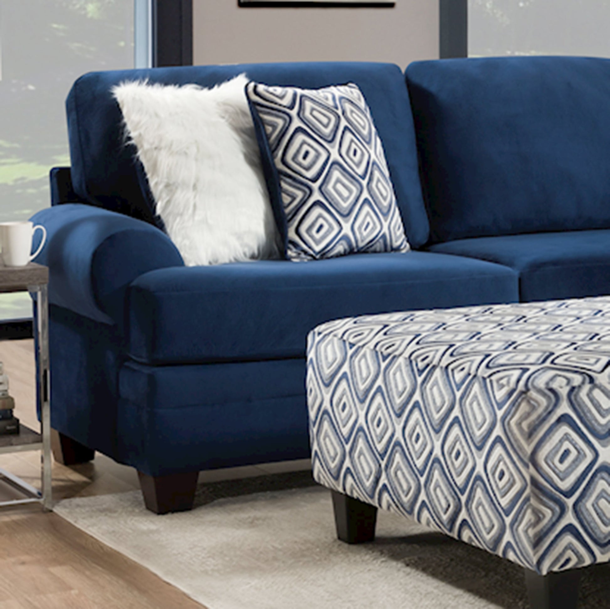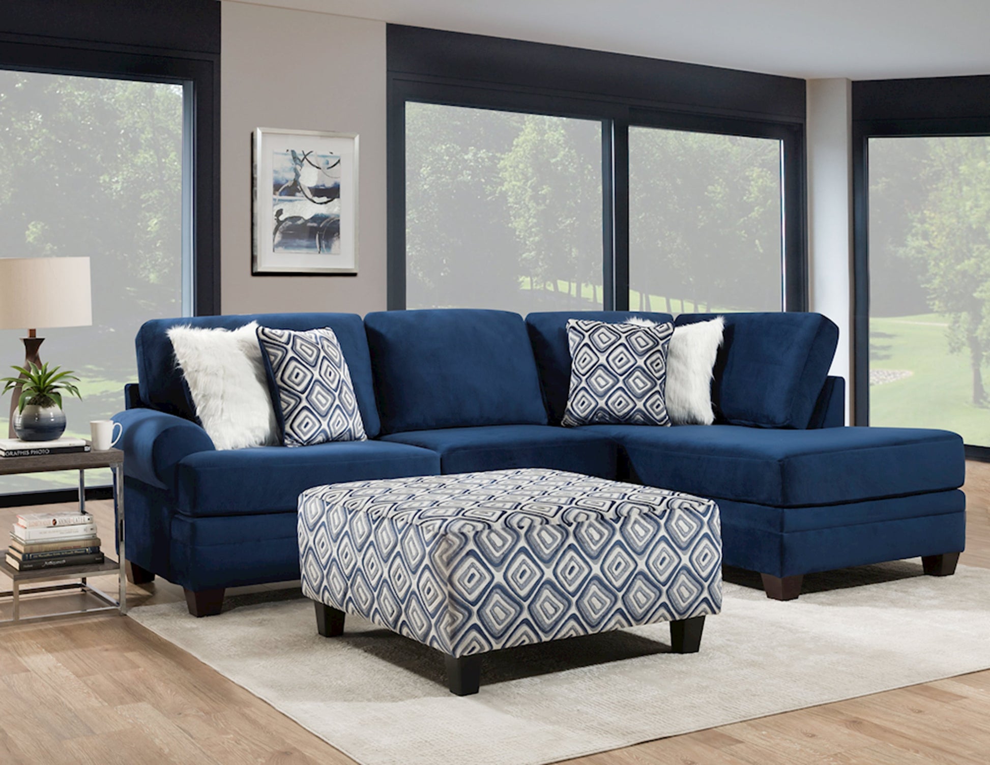 - The set includes a right-arm facing sectional sofa and a ottoman. Fabric upholstery in groovy navy color, chaise section for lounging