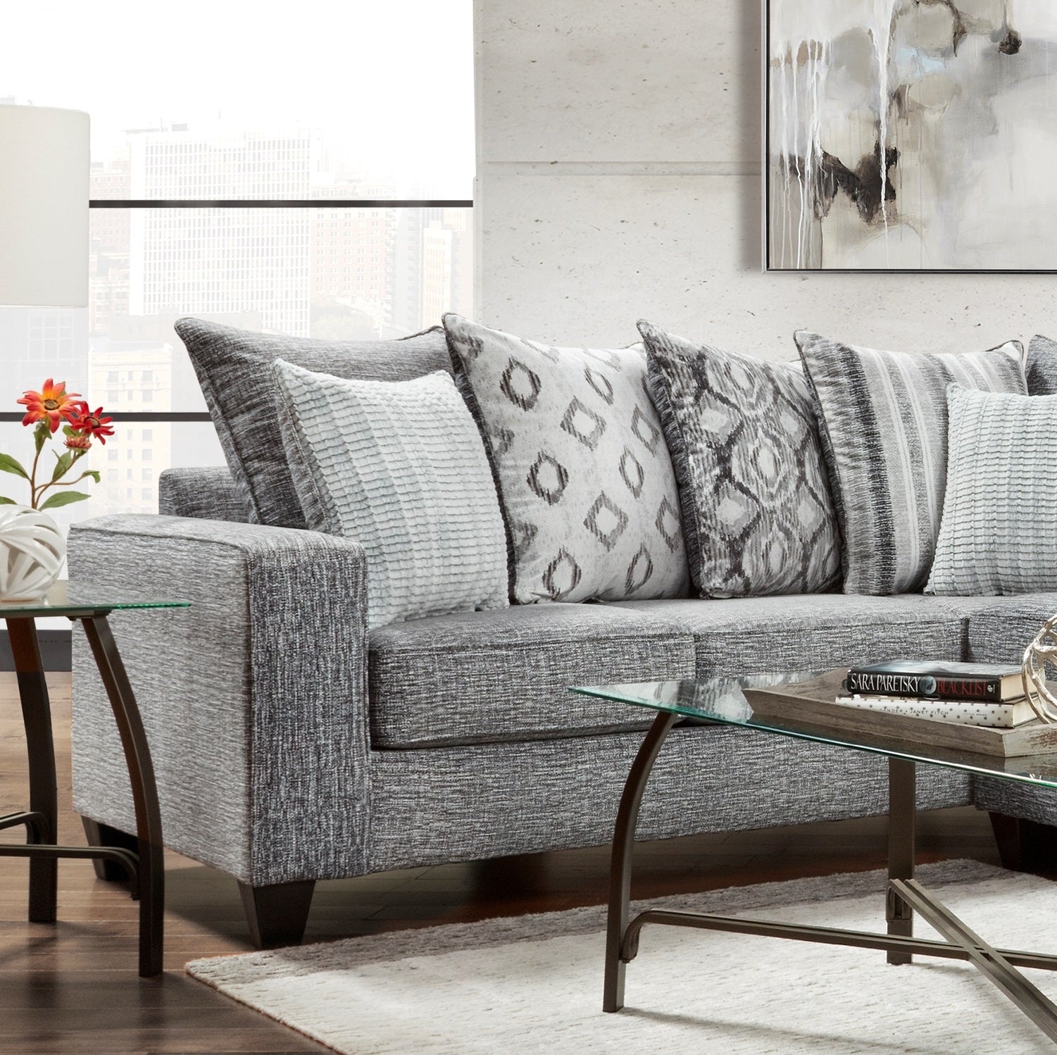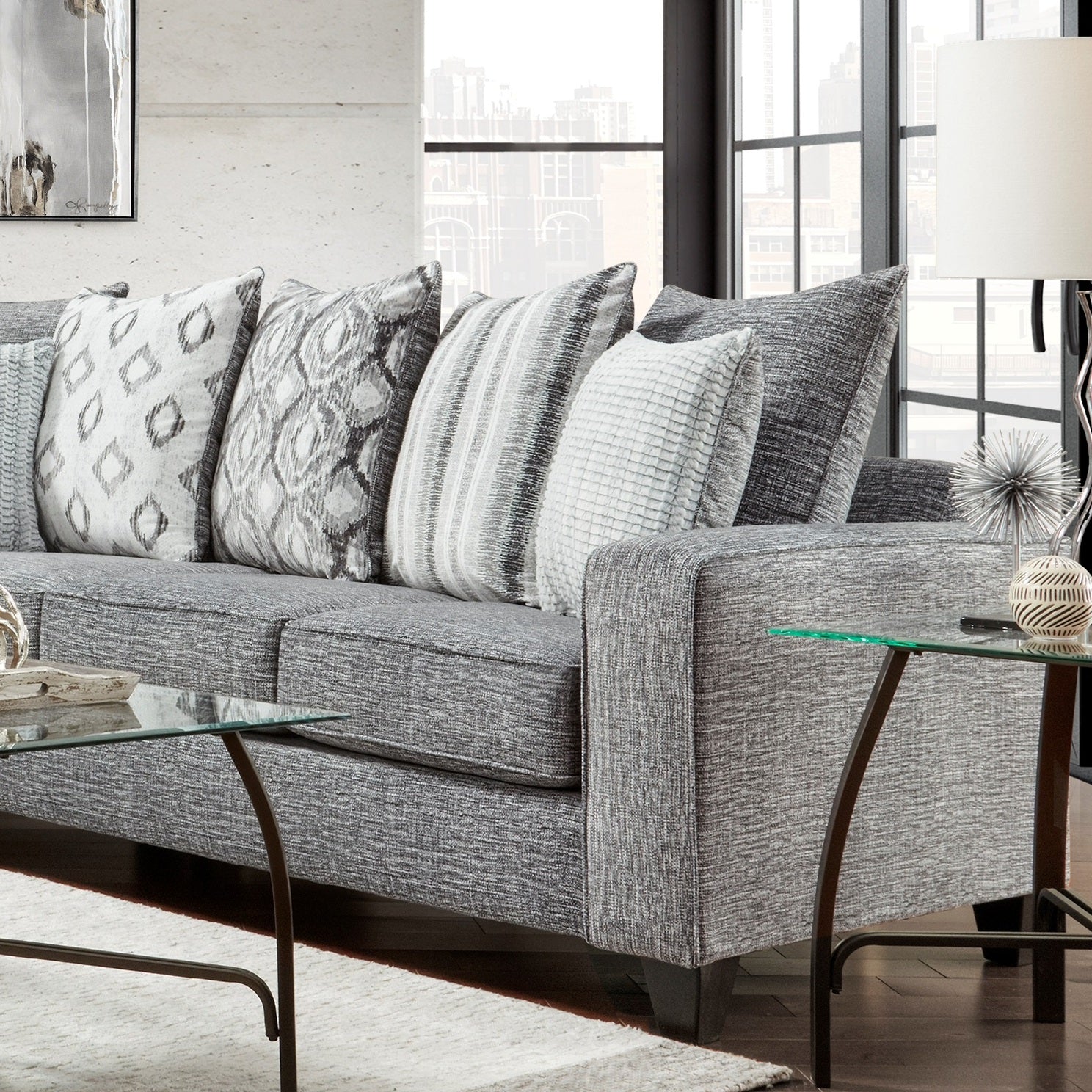 - Track arms, sleek silhouette, and the stonewash colored fabric with contrast pillow back bring it an elegant, contemporary touch
