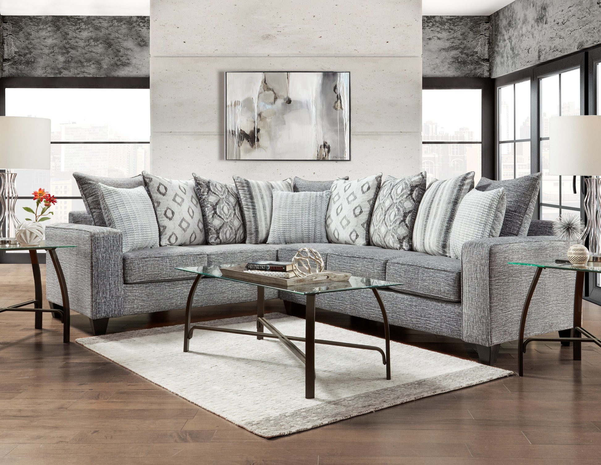 Spread out on the Elva Contemporary Fabric Pillow Back Sectional Sofa and enjoy your next family movie night with stylish comfort. This sectional is upholstered in a stonewash-colored polyester that's both easy to care for and easy to style. Accent pillows in different patterns are included with this spacious L-shaped sectional sofa. The contemporary design gives you wide track arms, removable seat and pillow back cushions, and simple legs of finished in espresso.