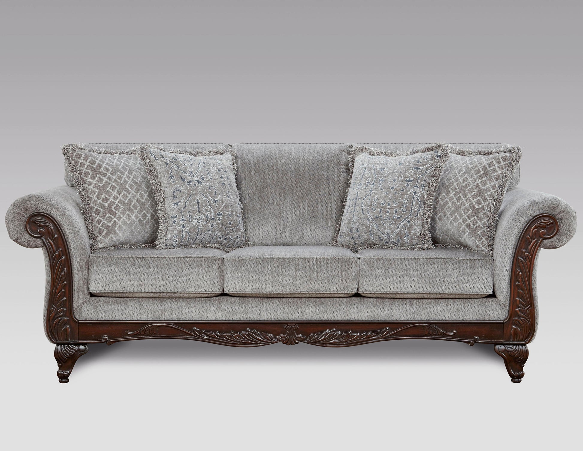 With its polyester blend upholstery and fabulous colors, this Hernen Carved Wood Frame Living Room Sofa is sure to be a luxurious addition to your living room. The rolled arms show off carved panels on the front and an adventurous mix of super-soft chenille fabric and printed throw pillows, designed legs with a rich espresso finish add a touch of contemporary elegance. Those carved wooden details continue across the arch of the lower face and hardwood feet. High-density foam padding adds deep support and comfort that you can enjoy every day.
