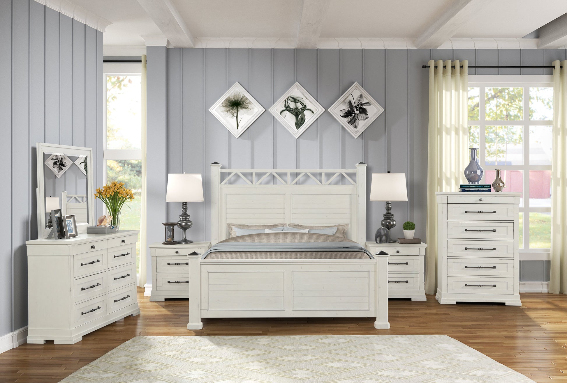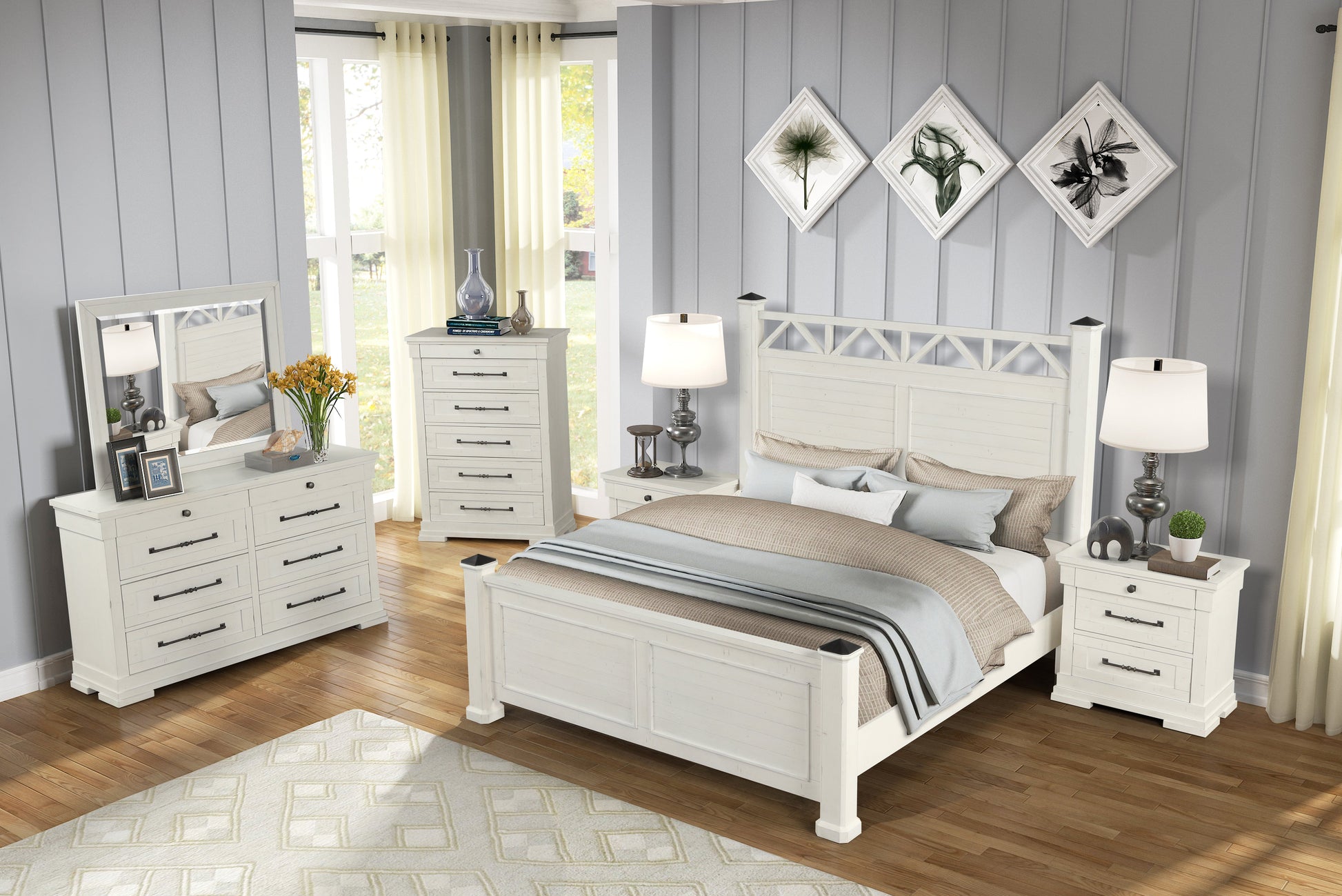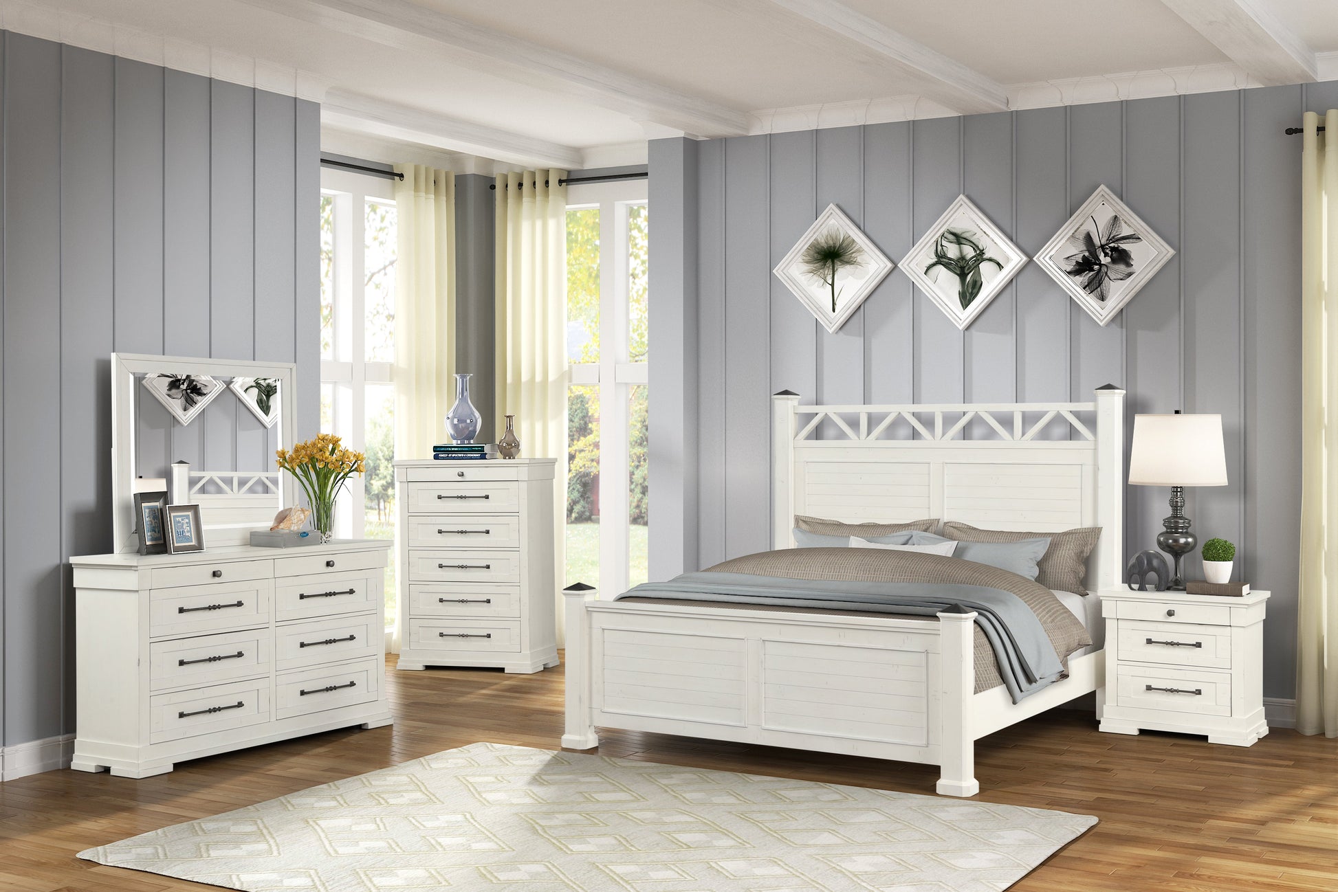 - The collection includes panel bed, dresser, mirror, and nightstand.