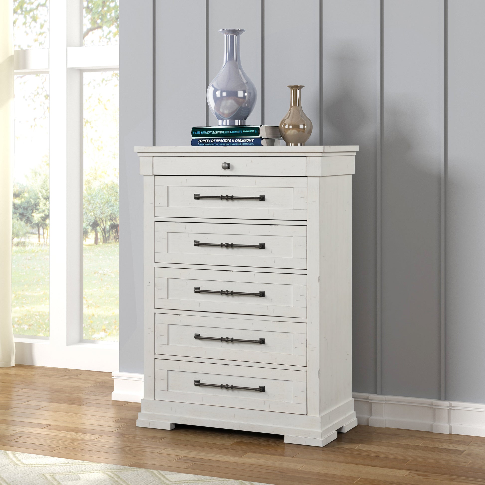 Transform your bedroom with the transitional style of the Laria Antique White Finish Wood Bedroom collection. Constructed of top quality, this set is finished with a 7-step process in antique white to bring out the natural woodgrain and textures. The slat-style headboard and footboard create a simple, versatile look. Chamfer detailing can be found on the posts on either side of the headboard and footboard. English dovetail construction and full-extension ball bearing metal drawer glide ensure perfectly smooth action, and the top drawers are luxuriously lined in felt. Dark metal hardware adds to the rustic sensibility of this set, it will complete your classic bedroom look.