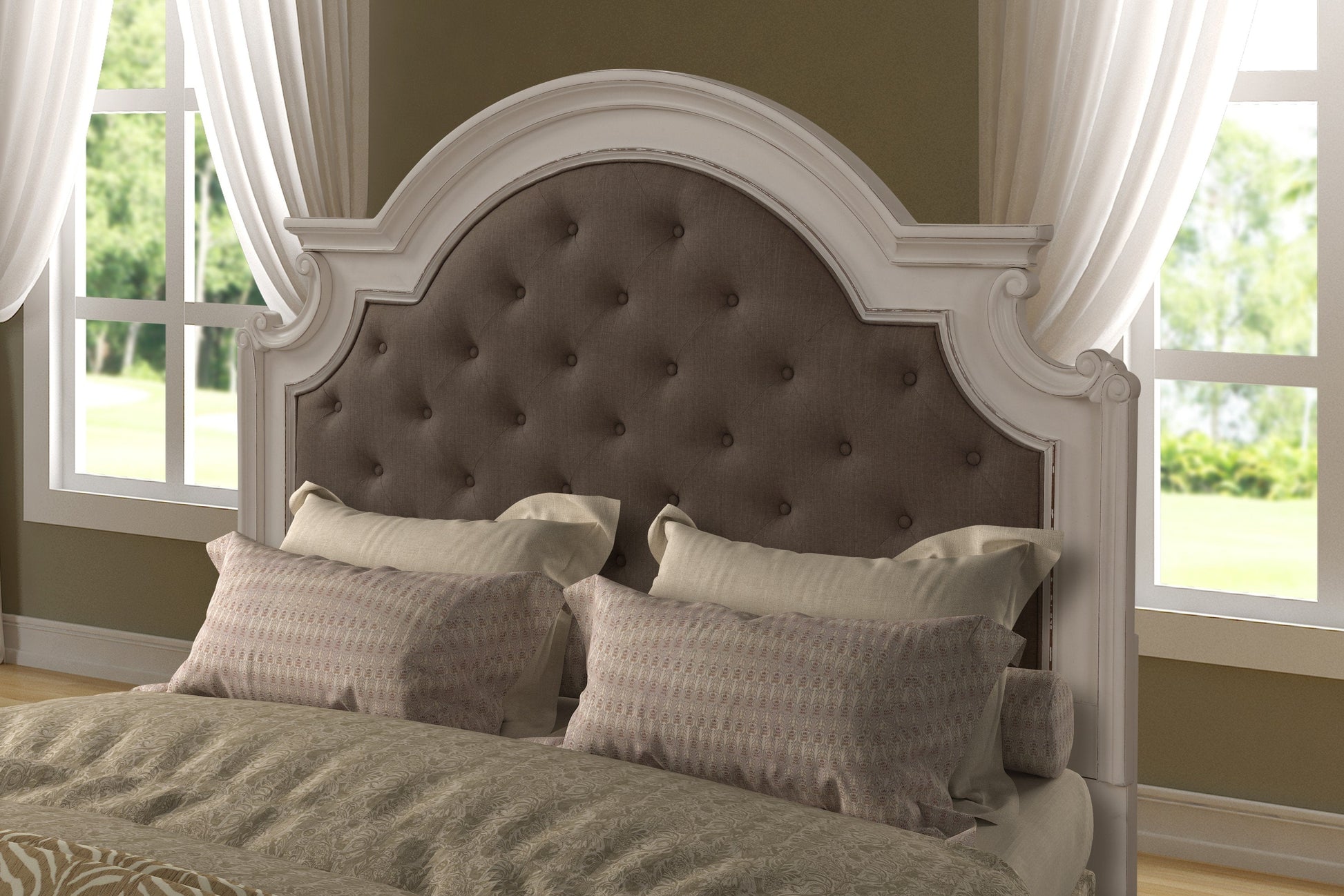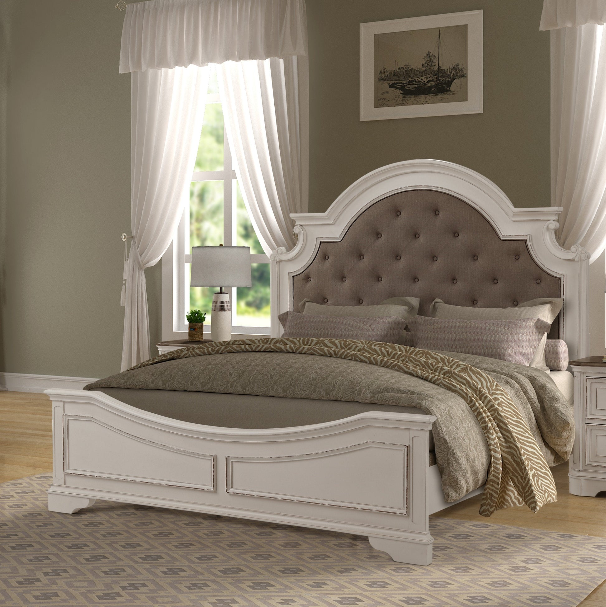 - The headboard is upholstered in tan linen-look upholstery that perfectly complements the rub-through white finish