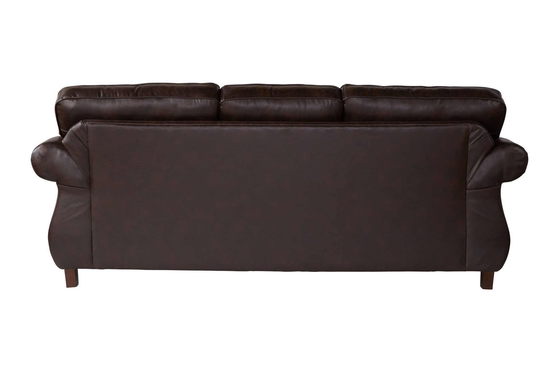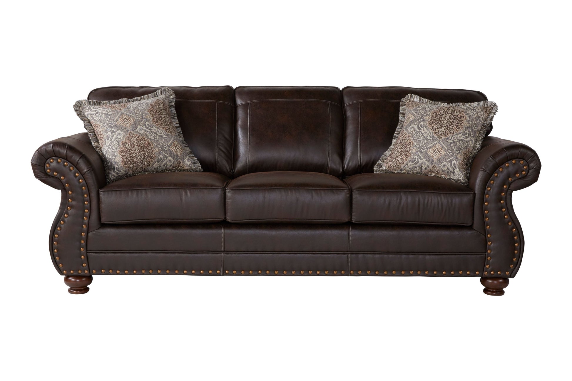 A classic silhouette and antiqued brown coloring make the Leinster Faux Leather Upholstered Nailhead Sofa traditional with a casual twist. This sofa is equipped with dramatic rolled arms, detailed welting, and striking nailhead trim. The soft faux leather upholstery comes in a deep espresso that coordinates with any decor.