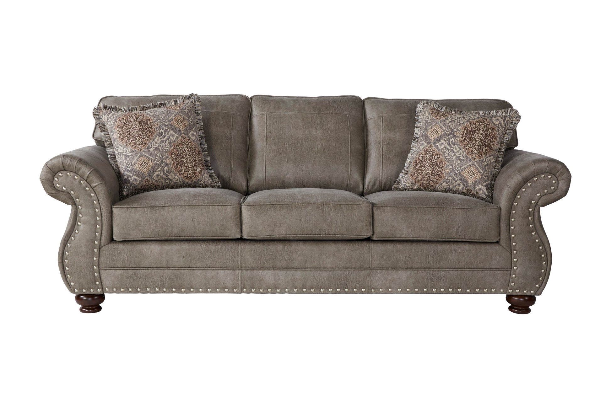 A classic silhouette and antiqued gray coloring make the Leinster Faux Leather Upholstered Nailhead Sofa traditional with a casual twist. This sofa is equipped with dramatic rolled arms, detailed welting, and striking nailhead trim. The soft faux leather upholstery comes in a stone gray that coordinates with any decor.