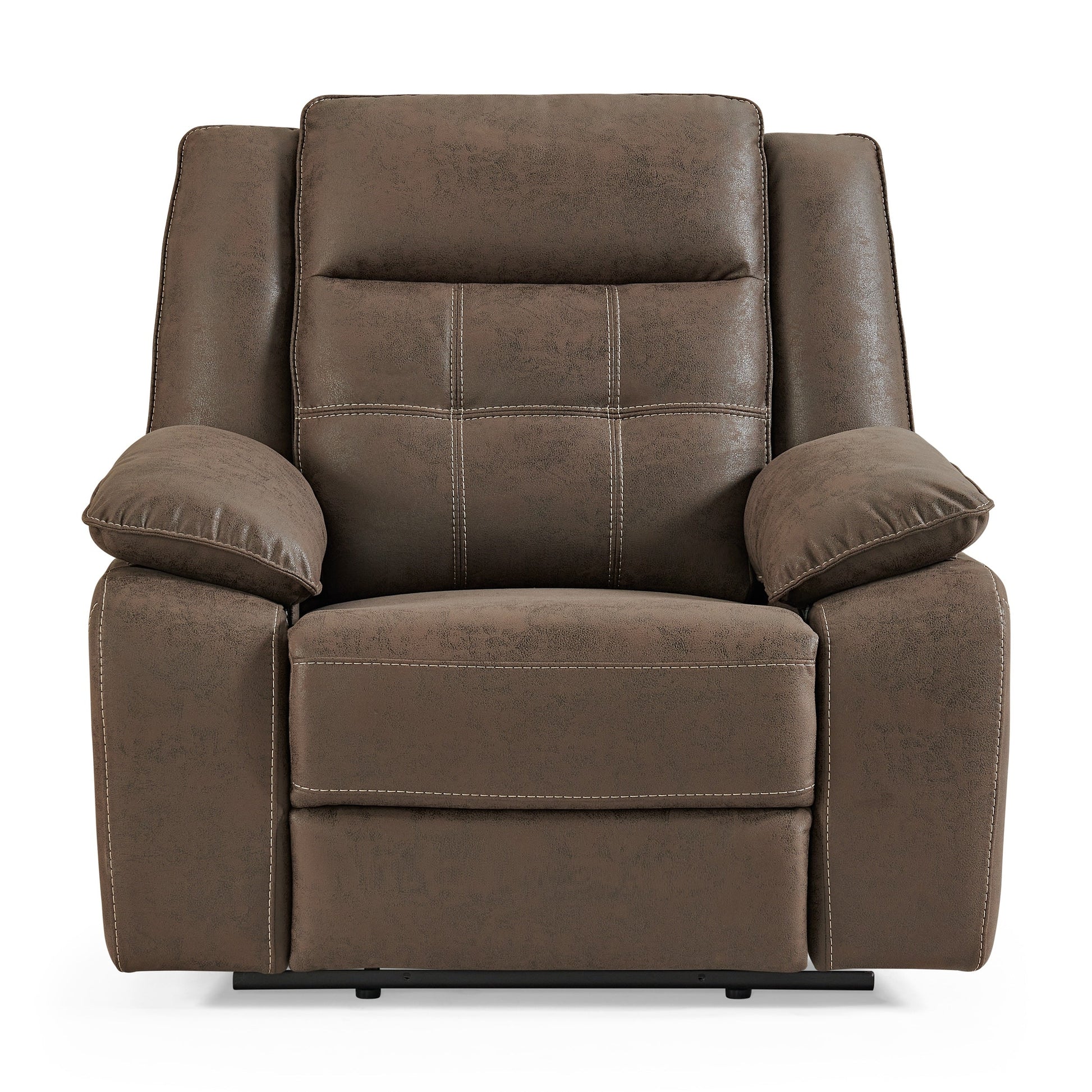 - ➤ [CUSHIONED BACK & PILLOW ARMS]: This Recliner showcases a plush cushioned-back style, designed for optimal comfort, complementing its smooth, sculptural lines. The sleek pillow arms are highlighted with brownie tones, offering charm and making it a standout piece in any room. The tan stitch detailing add a touch of warmth and contrast to the overall design, making it a timeless addition to any living space.