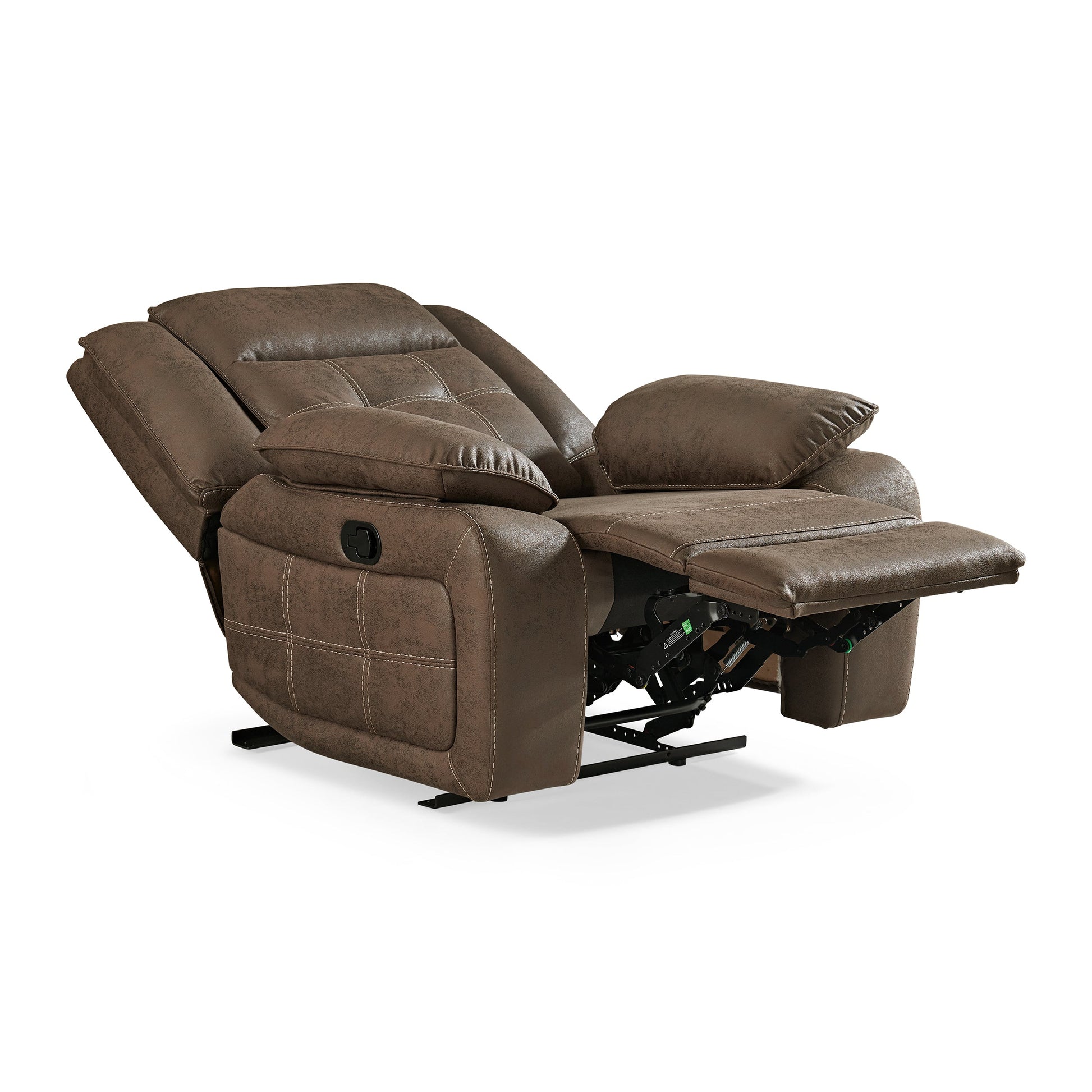 For a mix of comfort and style, introduce the Lesley Manual Recliner from Roundhill Furniture. The cushioned back and sleek pillow arms, in a captivating brown tone, add a touch of refinement to any room. The generous seat with Dacron-filled cushions offer superior comfort and support, creating a cozy haven in your living space. Its smooth reclining motion, controlled by a pull-tab side lever, ensures a seamless transition between positions for your utmost enjoyment. With a durable wood frame and metal mechanism base, this recliner is built to last, providing durability and stability for years to come.