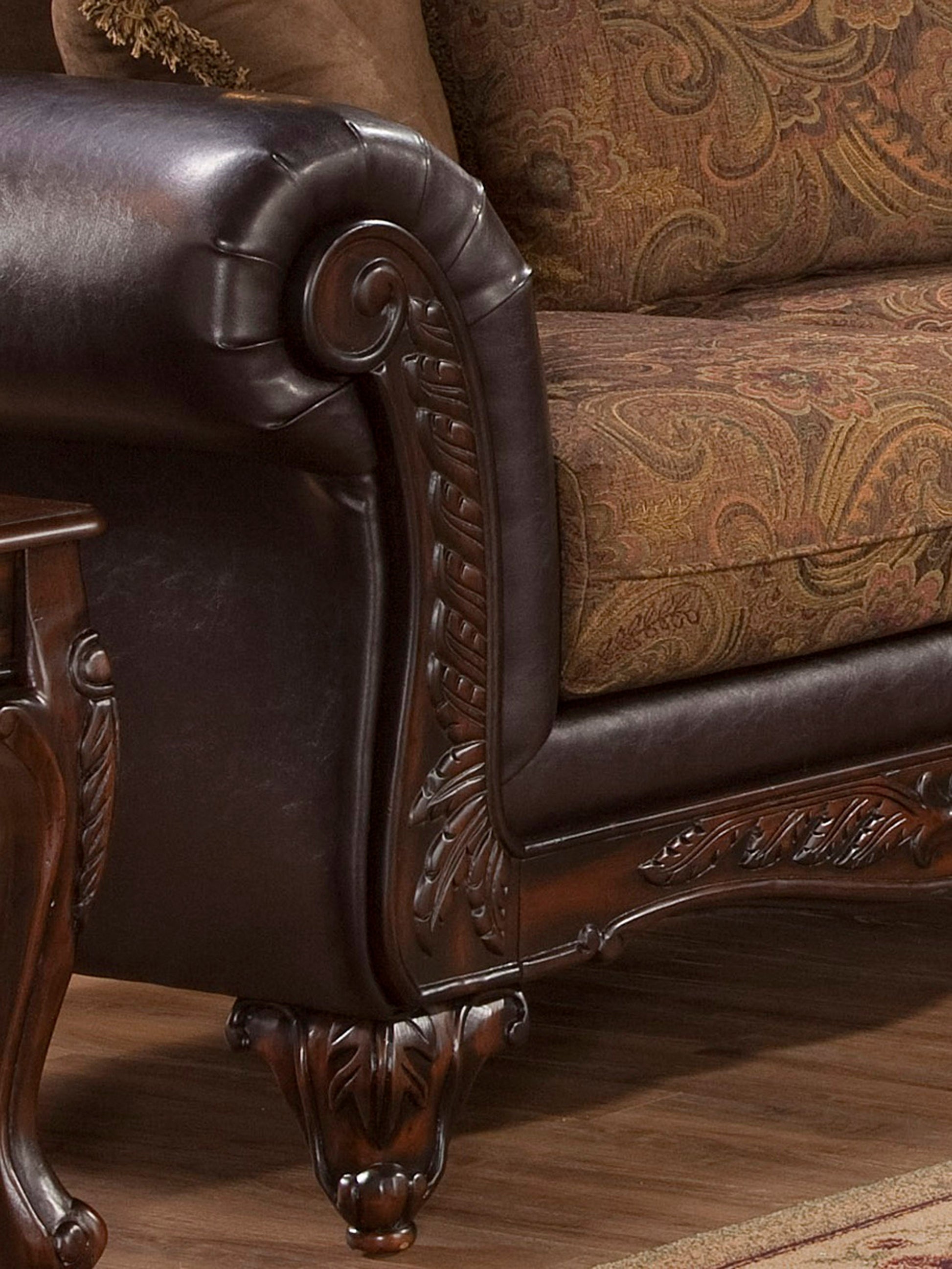The Classically styled pillow back San Marino Sofa Set is a beautiful combination of colors and fabrics that will bring warmth to any home. This sophisticated sofa set is covered in a rich coffee bean brown bi-cast material and the cushions and seat pillows are in a contrasting floral pattern fabric. The traditional details and carved wood face trim add elegance and grace to your living room.