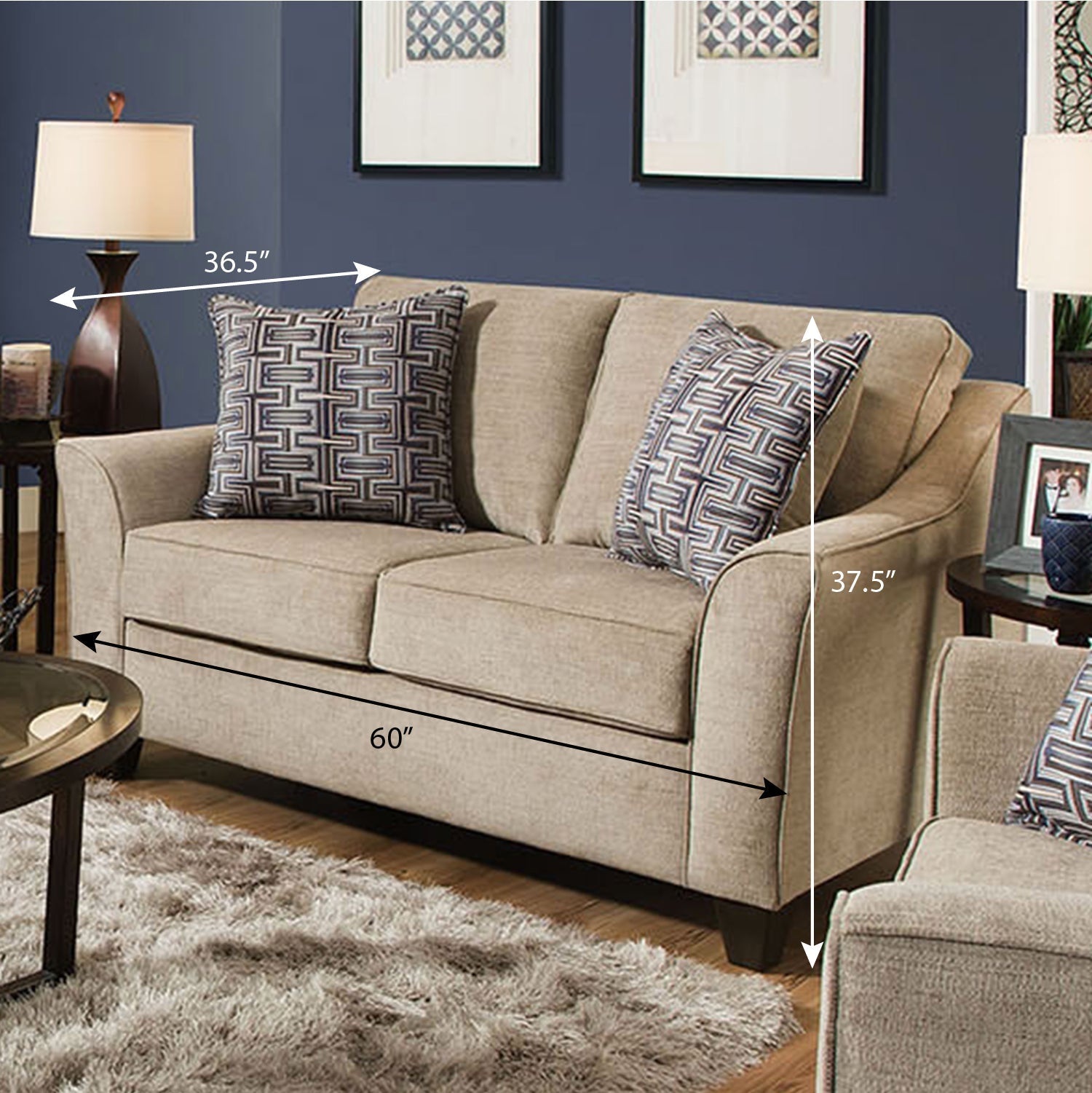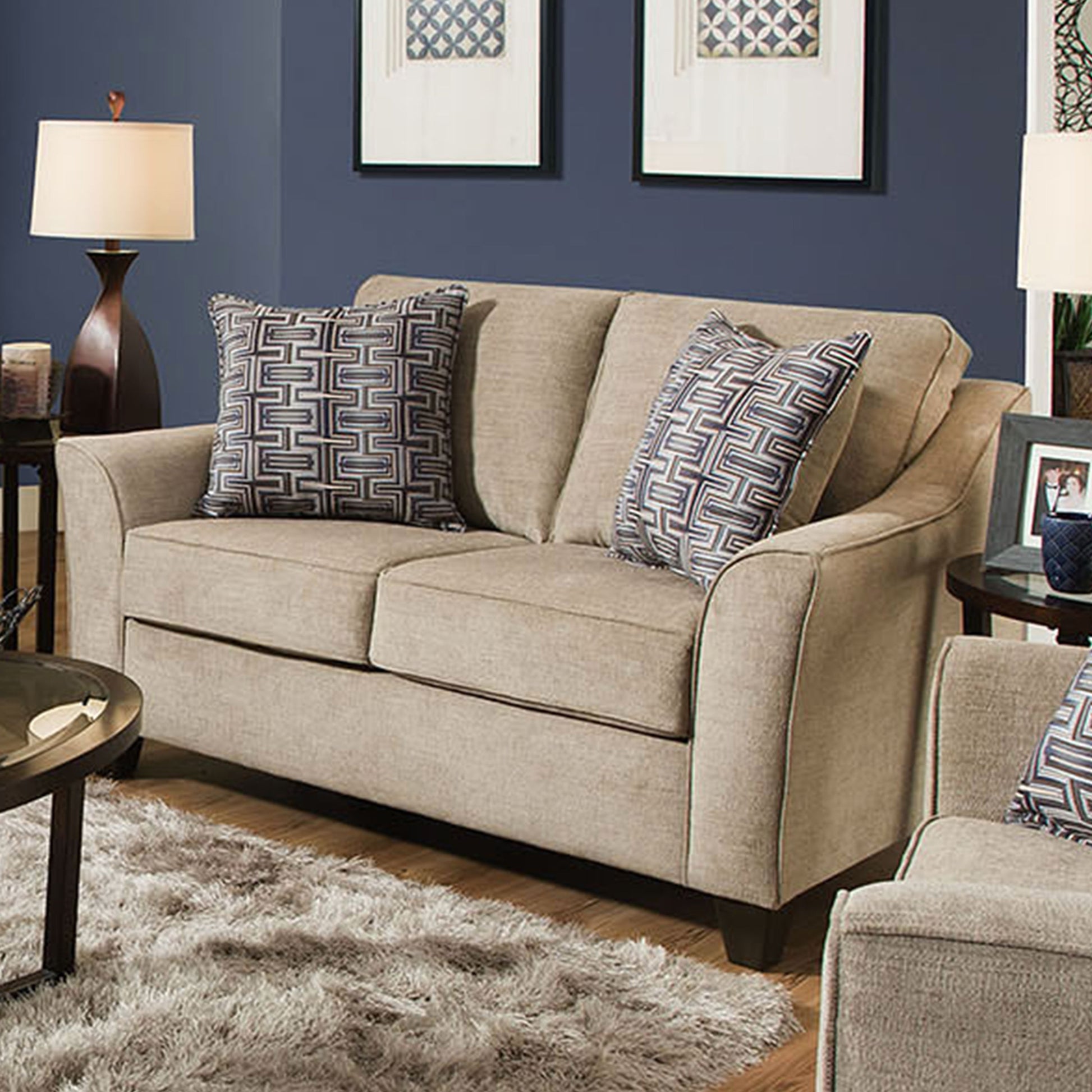 - The loveseat features flared arm and tapered legs. The welted arms, seats, and backs adds the transitional style