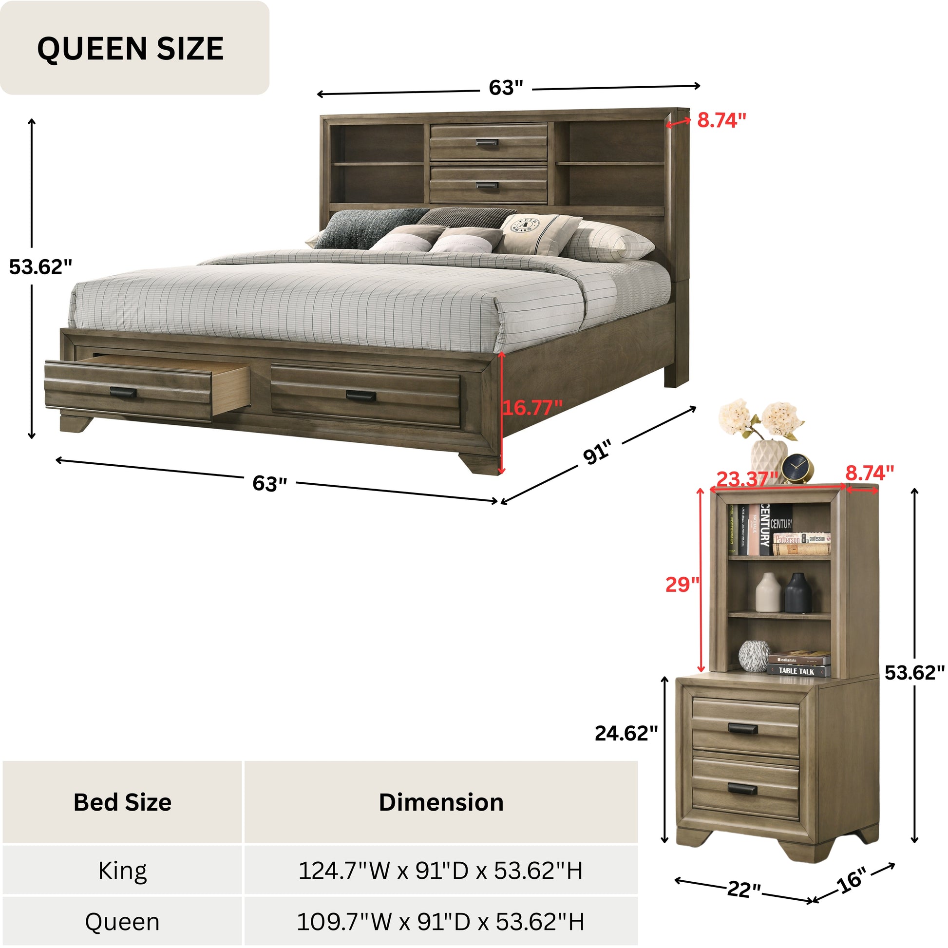 Storage under pier(nightstand): 22"W x 16"D x 24.62"H