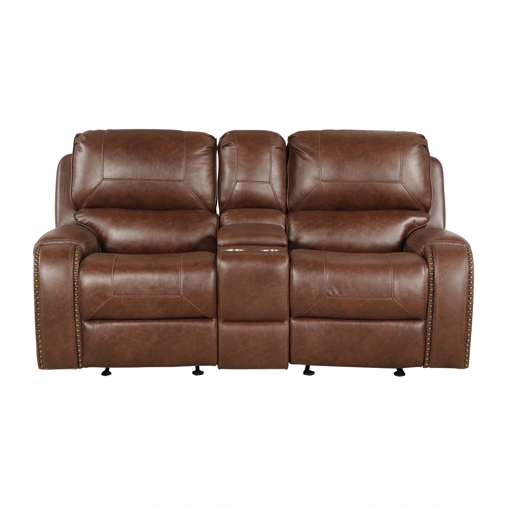 Increase the comfort level of your living room to its apex with the Achern Brown Leather-Air Nailhead Manual Reclining Loveseat with Storage Console. Brown faux leather upholstery covers every inch and is accented with topstitched seams. Best of all, both sides of the spacious loveseat gliding reclining system provide a cushiony footrest. Simply reach below the arm and pull gently on the lever, and you'll be ready for a well-deserved nap! And if that wasn't enough, the loveseat also includes a center storage console with two metal cup holders. Some assembly is required. Matching sofa and recliner sold separately.