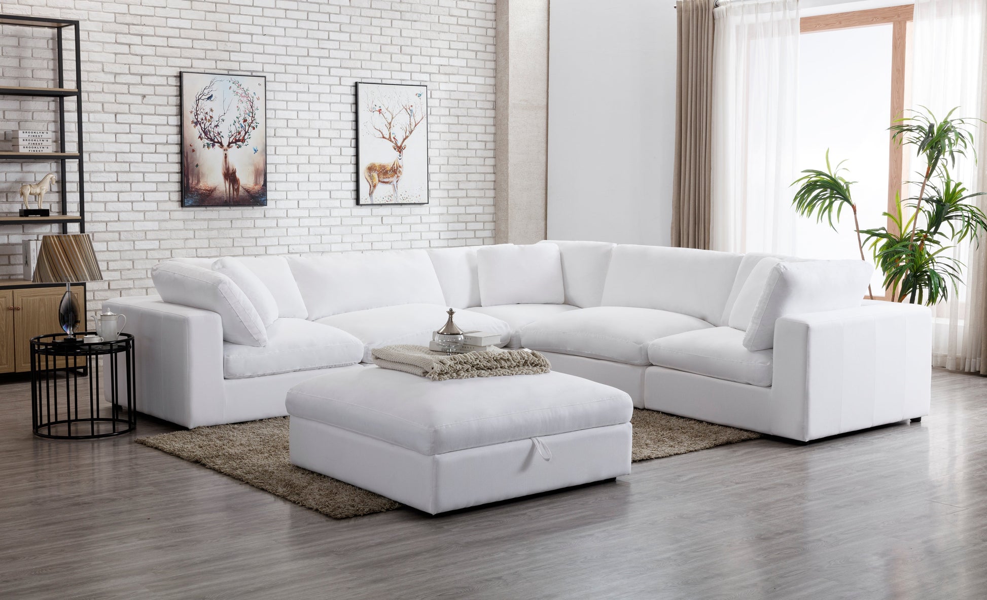 Rivas Contemporary Feather Fill 6-Piece Modular L-Sectional Sofa with Ottoman, White